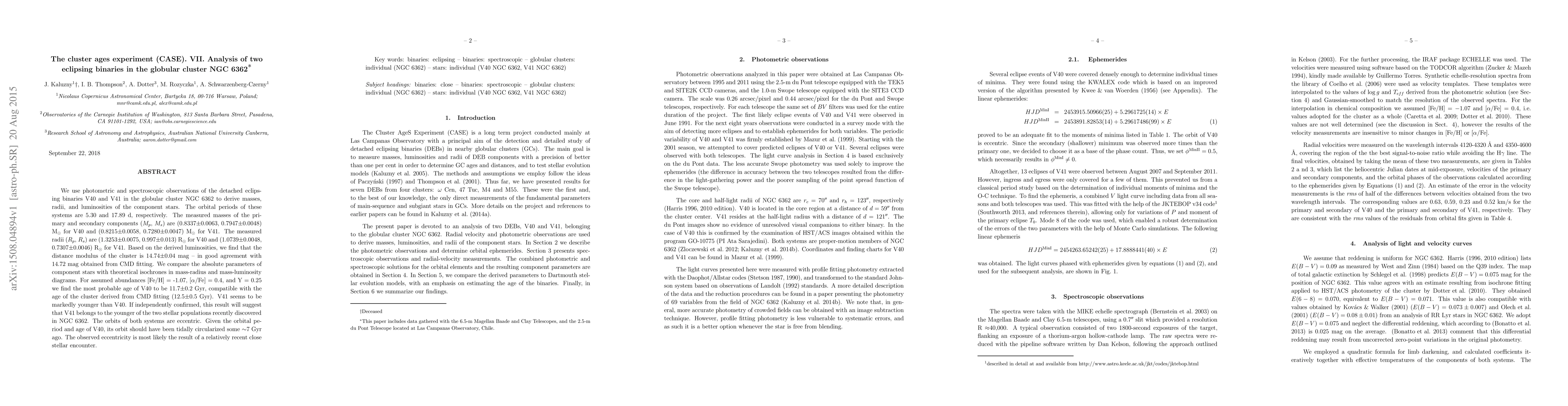 We use photometric and spectroscopic observations of the detached eclipsing binaries V40 and V41 in the globular cluster NGC 6362 to derive masses, radii, and luminosities of the component stars. The orbital periods of these systems are 5.30 and 17.89 d, respectively. The measured masses of the primary and secondary components ($M_p$, $M_s$) are (0.8337$\pm$0.0063, 0.7947$\pm$0.0048) M$_\odot$ for V40 and (0.8215$\pm$0.0058, 0.7280$\pm$0.0047) M$_\odot$ for V41. The measured radii ($R_p$, $R_s$) are (1.3253$\pm$0.0075, 0.997$\pm$0.013) R$_\odot$ for V40 and (1.0739$\pm$0.0048, 0.7307$\pm$0.0046) R$_\odot$ for V41. Based on the derived luminosities, we find that the distance modulus of the cluster is 14.74$\pm$0.04 mag -- in good agreement with 14.72 mag obtained from CMD fitting. We compare the absolute parameters of component stars with theoretical isochrones in mass-radius and mass-luminosity diagrams. For assumed abundances [Fe/H] = -1.07, [$\alpha$/Fe] = 0.4, and Y = 0.25 we find the most probable age of V40 to be 11.7$\pm$0.2 Gyr, compatible with the age of the cluster derived from CMD fitting (12.5$\pm$0.5 Gyr). V41 seems to be markedly younger than V40. If independently confirmed, this result will suggest that V41 belongs to the younger of the two stellar populations recently discovered in NGC 6362. The orbits of both systems are eccentric. Given the orbital period and age of V40, its orbit should have been tidally circularized some $\sim$7 Gyr ago. The observed eccentricity is most likely the result of a relatively recent close stellar encounter.