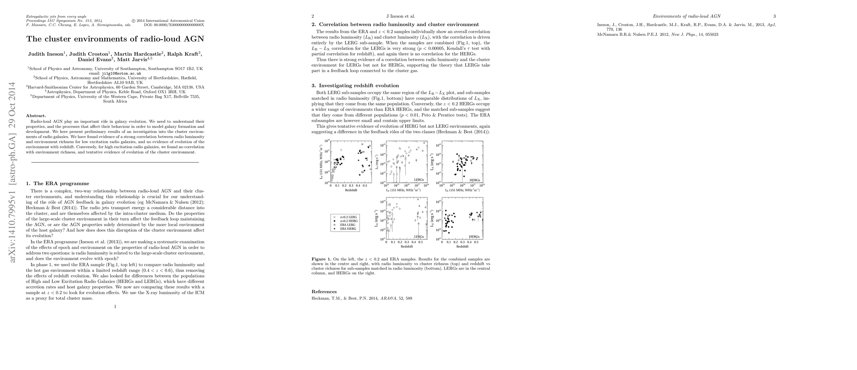 Radio-loud AGN play an important r\^ole in galaxy evolution. We need to understand their properties, and the processes that affect their behaviour in order to model galaxy formation and development. We here present preliminary results of an investigation into the cluster environments of radio galaxies. We have found evidence of a strong correlation between radio luminosity and environment richness for low excitation radio galaxies, and no evidence of evolution of the environment with redshift. Conversely, for high excitation radio galaxies, we found no correlation with environment richness, and tentative evidence of evolution of the cluster environment.