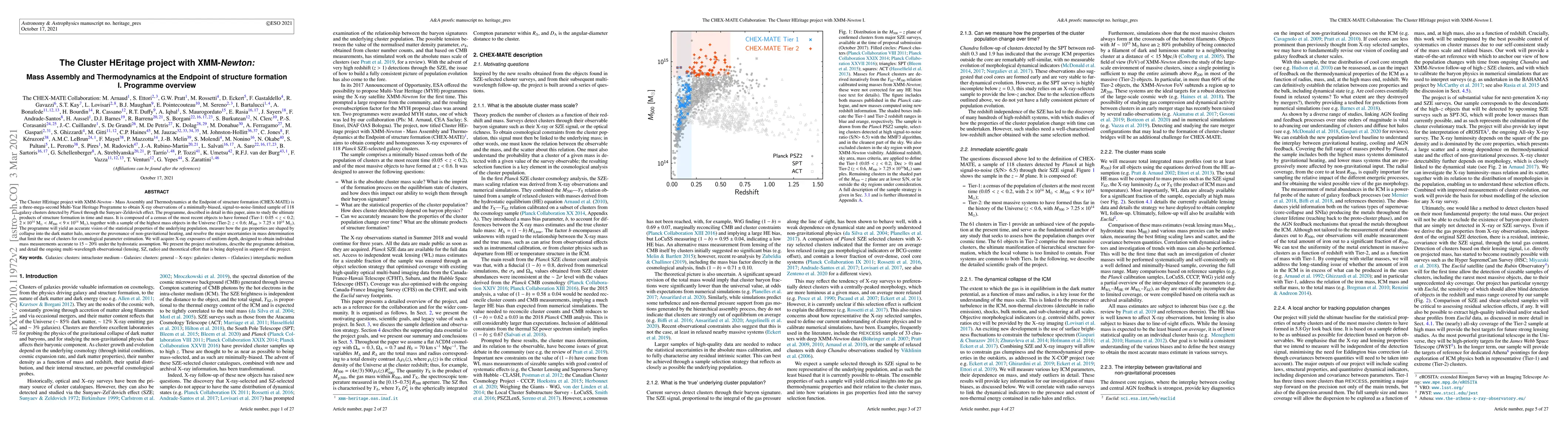 The Cluster HEritage project with XMM-Newton - Mass Assembly and Thermodynamics at the Endpoint of structure formation (CHEX-MATE) is a three mega-second Multi-Year Heritage Programme to obtain X-ray observations of a minimally-biased, signal-to-noise limited sample of 118 galaxy clusters detected by Planck through the Sunyaev-Zeldovich effect. The programme, described in detail in this paper, aims to study the ultimate products of structure formation in time and mass. It is composed of a census of the most recent objects to have formed (Tier-1: 0.05 < z < 0.2; 2 x 10e14 M_sun < M_500 < 9 x 10e14 M_sun), together with a sample of the highest-mass objects in the Universe (Tier-2: z < 0.6; M_500 > 7.25 x 10e14 M_sun). The programme will yield an accurate vision of the statistical properties of the underlying population, measure how the gas properties are shaped by collapse into the dark matter halo, uncover the provenance of non-gravitational heating, and resolve the major uncertainties in mass determination that limit the use of clusters for cosmological parameter estimation. We will acquire X-ray exposures of uniform depth, designed to obtain individual mass measurements accurate to 15-20% under the hydrostatic assumption. We present the project motivations, describe the programme definition, and detail the ongoing multi-wavelength observational (lensing, SZ, radio) and theoretical effort that is being deployed in support of the project.
