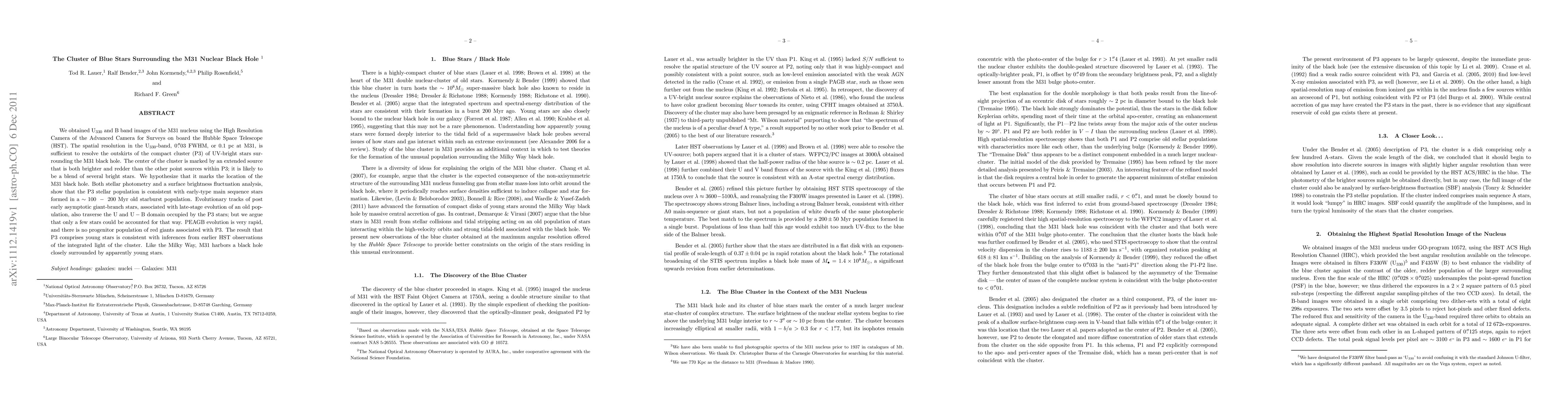 We obtained U_330 and B band images of the M31 nucleus using the High Resolution Camera of the Advanced Camera for Surveys on board the Hubble Space Telescope (HST). The spatial resolution in the U_330-band, 0.03" FWHM, or 0.1 pc at M31, is sufficient to resolve the outskirts of the compact cluster (P3) of UV-bright stars surrounding the M31 black hole. The center of the cluster is marked by an extended source that is both brighter and redder than the other point sources within P3; it is likely to be a blend of several bright stars. We hypothesize that it marks the location of the M31 black hole. Both stellar photometry and a surface brightness fluctuation analysis, show that the P3 stellar population is consistent with early-type main sequence stars formed in a ~100 - ~200 Myr old starburst population. Evolutionary tracks of post early asymptotic giant-branch stars, associated with late-stage evolution of an old population, also traverse the U and U-B domain occupied by the P3 stars; but we argue that only a few stars could be accounted for that way. PEAGB evolution is very rapid, and there is no progenitor population of red giants associated with P3. The result that P3 comprises young stars is consistent with inferences from earlier HST observations of the integrated light of the cluster. Like the Milky Way, M31 harbors a black hole closely surrounded by apparently young stars.