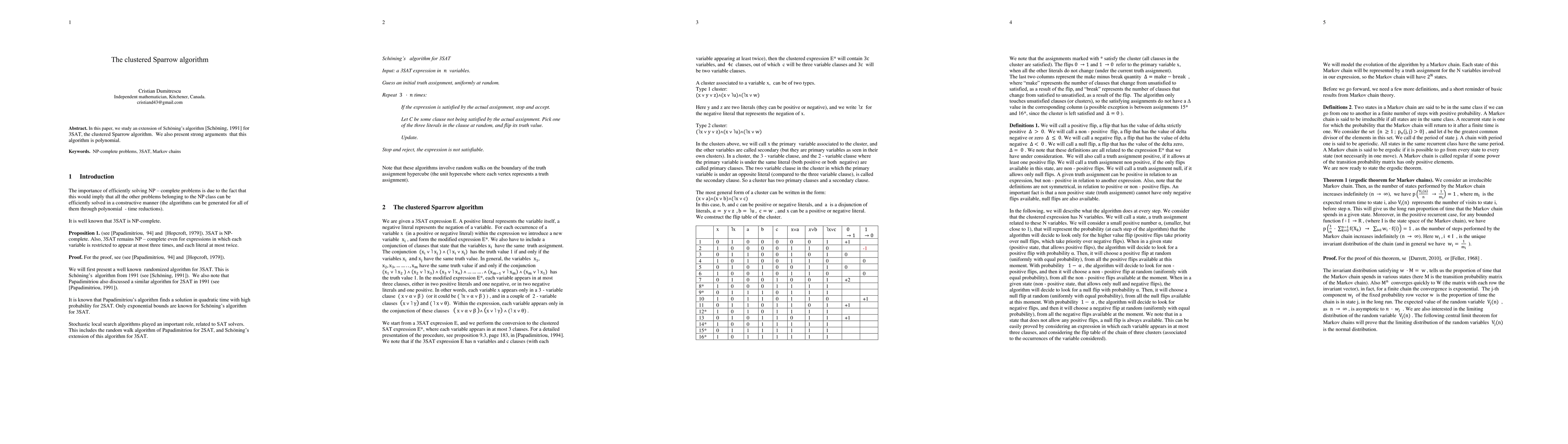 Summary: This paper extends Schoning's algorithm for solving 3SAT problems with the clustered Sparrow algorithm, providing strong evidence to support its polynomial time complexity.