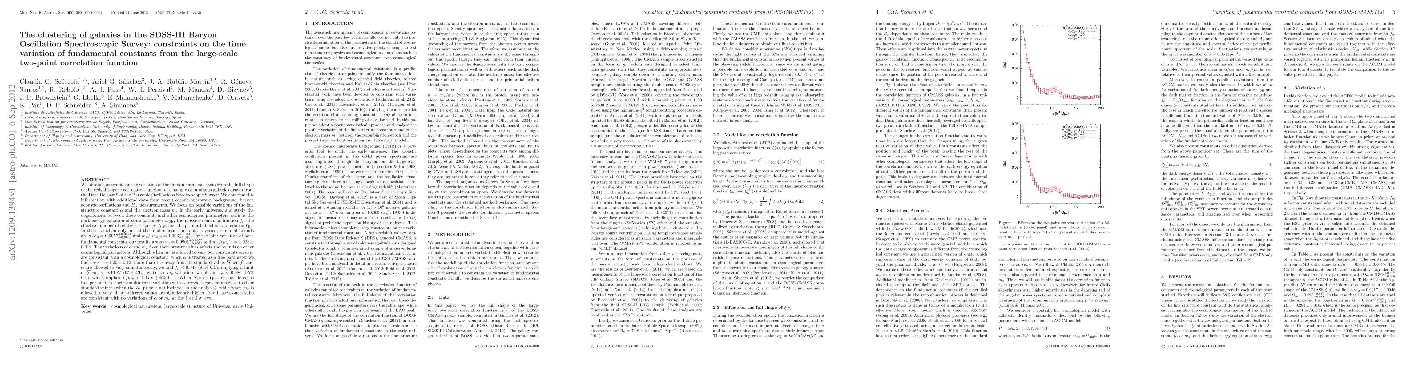 We obtain constraints on the variation of the fundamental constants from the full shape of the redshift-space correlation function of a sample of luminous galaxies drawn from the Data Release 9 of the Baryonic Oscillations Spectroscopic Survey. We combine this information with data from recent CMB, BAO and H_0 measurements. We focus on possible variations of the fine structure constant \alpha and the electron mass m_e in the early universe, and study the degeneracies between these constants and other cosmological parameters, such as the dark energy equation of state parameter w_DE, the massive neutrinos fraction f_\nu, the effective number of relativistic species N_eff, and the primordial helium abundance Y_He. When only one of the fundamental constants is varied, our final bounds are \alpha / \alpha_0 = 0.9957_{-0.0042}^{+0.0041} and m_e /(m_e)_0 = 1.006_{-0.013}^{+0.014}. For their joint variation, our results are \alpha / \alpha_0 = 0.9901_{-0.0054}^{+0.0055} and m_e /(m_e)_0 = 1.028 +/- 0.019. Although when m_e is allowed to vary our constraints on w_DE are consistent with a cosmological constant, when \alpha is treated as a free parameter we find w_DE = -1.20 +/- 0.13; more than 1 \sigma away from its standard value. When f_\nu and \alpha are allowed to vary simultaneously, we find f_\nu < 0.043 (95% CL), implying a limit of \sum m_\nu < 0.46 eV (95% CL), while for m_e variation, we obtain f_nu < 0.086 (95% CL), which implies \sum m_\nu < 1.1 eV (95% CL). When N_eff or Y_He are considered as free parameters, their simultaneous variation with \alpha provides constraints close to their standard values (when the H_0 prior is not included in the analysis), while when m_e is allowed to vary, their preferred values are significantly higher. In all cases, our results are consistent with no variations of \alpha or m_e at the 1 or 2 \sigma level.