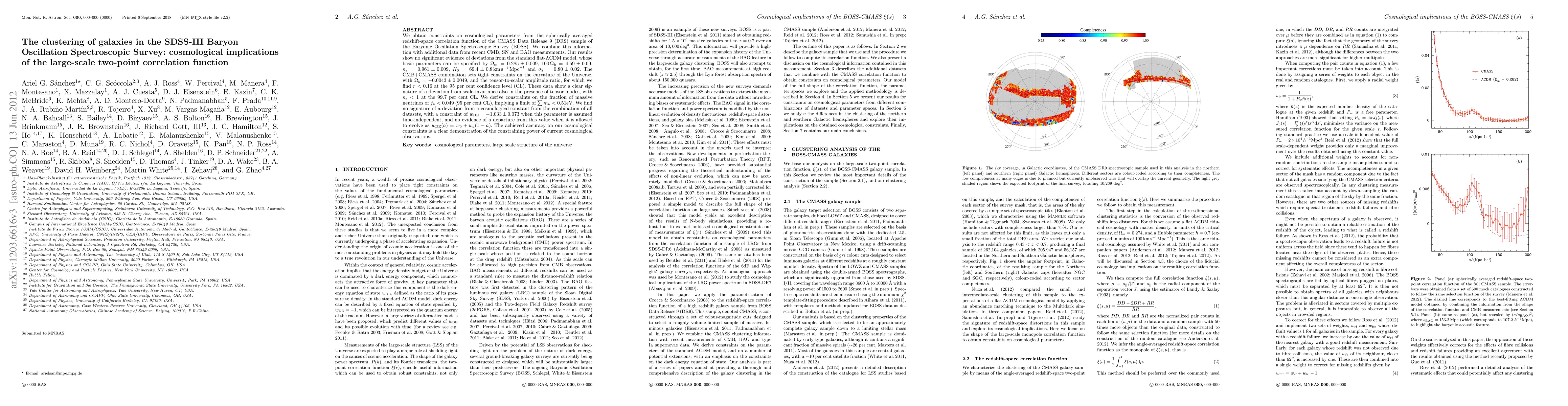 We obtain constraints on cosmological parameters from the spherically averaged redshift-space correlation function of the CMASS Data Release 9 (DR9) sample of the Baryonic Oscillation Spectroscopic Survey (BOSS). We combine this information with additional data from recent CMB, SN and BAO measurements. Our results show no significant evidence of deviations from the standard flat-Lambda CDM model, whose basic parameters can be specified by Omega_m = 0.285 +- 0.009, 100 Omega_b = 4.59 +- 0.09, n_s = 0.96 +- 0.009, H_0 = 69.4 +- 0.8 km/s/Mpc and sigma_8 = 0.80 +- 0.02. The CMB+CMASS combination sets tight constraints on the curvature of the Universe, with Omega_k = -0.0043 +- 0.0049, and the tensor-to-scalar amplitude ratio, for which we find r < 0.16 at the 95 per cent confidence level (CL). These data show a clear signature of a deviation from scale-invariance also in the presence of tensor modes, with n_s <1 at the 99.7 per cent CL. We derive constraints on the fraction of massive neutrinos of f_nu < 0.049 (95 per cent CL), implying a limit of sum m_nu < 0.51 eV. We find no signature of a deviation from a cosmological constant from the combination of all datasets, with a constraint of w_DE = -1.033 +- 0.073 when this parameter is assumed time-independent, and no evidence of a departure from this value when it is allowed to evolve as w_DE(a) = w_0 + w_a (1 - a). The achieved accuracy on our cosmological constraints is a clear demonstration of the constraining power of current cosmological observations.