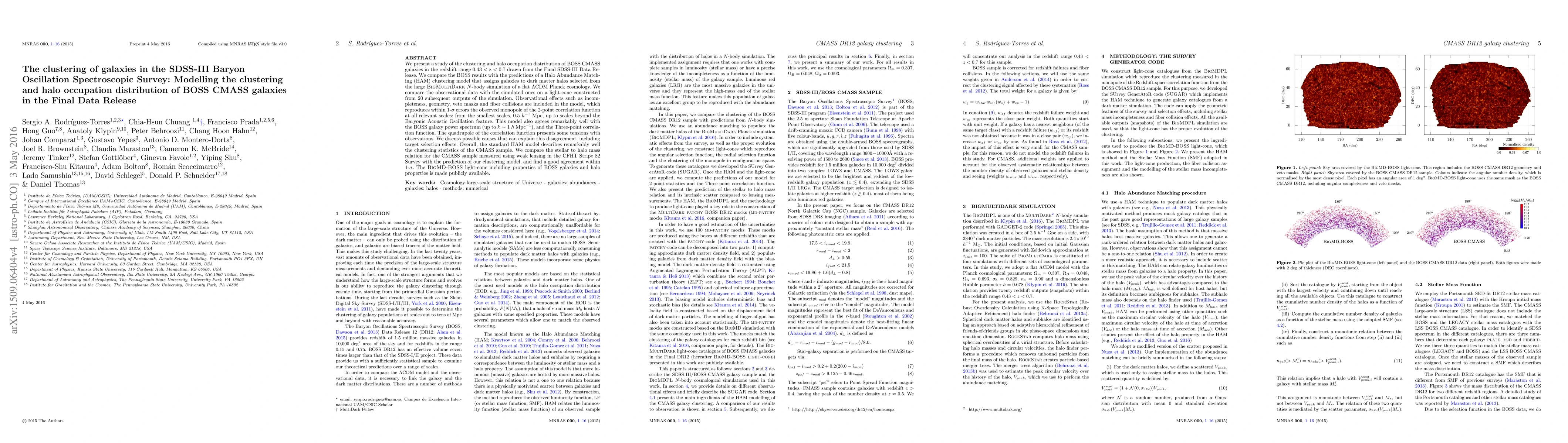 We present a study of the clustering and halo occupation distribution of BOSS CMASS galaxies in the redshift range 0.43 < z < 0.7 drawn from the Final SDSS-III Data Release. We compare the BOSS results with the predictions of a Halo Abundance Matching (HAM) clustering model that assigns galaxies to dark matter halos selected from the large BigMultiDark $N$-body simulation of a flat $\Lambda$CDM Planck cosmology. We compare the observational data with the simulated ones on a light-cone constructed from 20 subsequent outputs of the simulation. Observational effects such as incompleteness, geometry, veto masks and fiber collisions are included in the model, which reproduces within 1-$\sigma$ errors the observed monopole of the 2-point correlation function at all relevant scales: from the smallest scales, 0.5 $h^{-1}$ Mpc, up to scales beyond the Baryonic Acoustic Oscillation feature. This model also agrees remarkably well with the BOSS galaxy power spectrum (up to $k\sim1$ $h$ Mpc$^{-1}$), and the Three-point correlation function. The quadrupole of the correlation function presents some tensions with observations. We discuss possible causes that can explain this disagreement, including target selection effects. Overall, the standard HAM model describes remarkably well the clustering statistics of the CMASS sample. We compare the stellar to halo mass relation for the CMASS sample measured using weak lensing in the CFHT Stripe 82 Survey with the prediction of our clustering model, and find a good agreement within 1-$\sigma$. The BigMD-BOSS light-cone including properties of BOSS galaxies and halo properties is made publicly available.