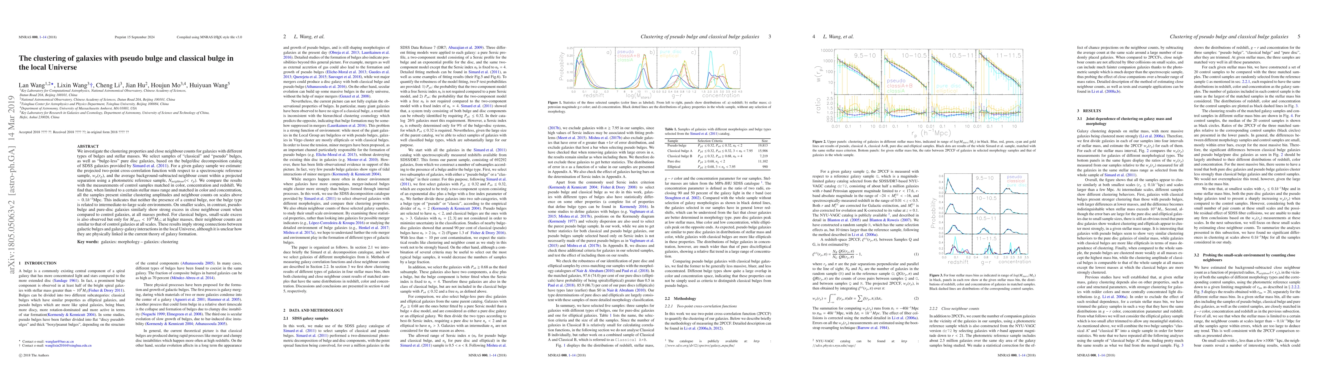 Galaxies with classical and pseudo bulges show similar clustering patterns to control galaxies on large scales, but have excess close neighbor counts on small scales, suggesting a connection to galaxy-galaxy interactions.