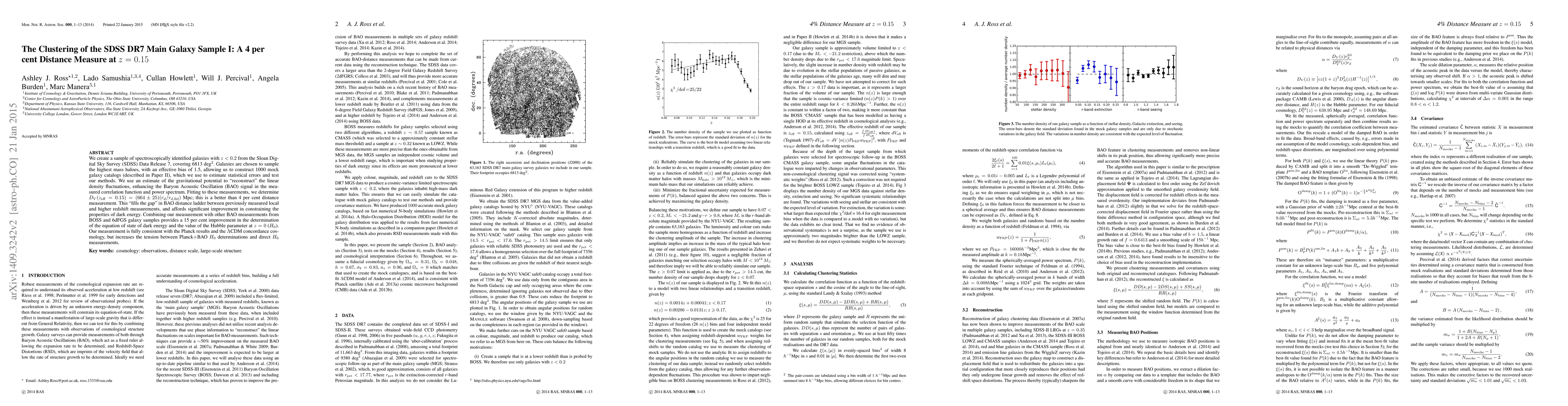 We create a sample of spectroscopically identified galaxies with $z < 0.2$ from the Sloan Digital Sky Survey (SDSS) Data Release 7, covering 6813 deg$^2$. Galaxies are chosen to sample the highest mass haloes, with an effective bias of 1.5, allowing us to construct 1000 mock galaxy catalogs (described in Paper II), which we use to estimate statistical errors and test our methods. We use an estimate of the gravitational potential to "reconstruct" the linear density fluctuations, enhancing the Baryon Acoustic Oscillation (BAO) signal in the measured correlation function and power spectrum. Fitting to these measurements, we determine $D_{V}(z_{\rm eff}=0.15) = (664\pm25)(r_d/r_{d,{\rm fid}})$ Mpc; this is a better than 4 per cent distance measurement. This "fills the gap" in BAO distance ladder between previously measured local and higher redshift measurements, and affords significant improvement in constraining the properties of dark energy. Combining our measurement with other BAO measurements from BOSS and 6dFGS galaxy samples provides a 15 per cent improvement in the determination of the equation of state of dark energy and the value of the Hubble parameter at $z=0$ ($H_0$). Our measurement is fully consistent with the Planck results and the $\Lambda$CDM concordance cosmology, but increases the tension between Planck$+$BAO $H_0$ determinations and direct $H_0$ measurements.