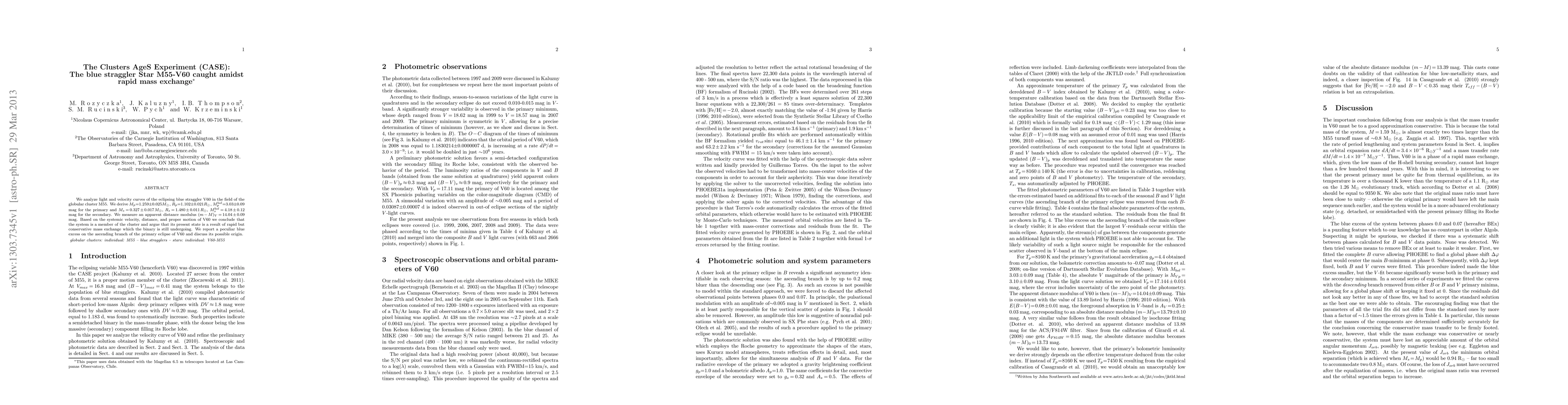 The Clusters AgeS Experiment (CASE) investigates the eclipsing blue straggler V60 in globular cluster M55, revealing it to be a member of the cluster undergoing rapid mass exchange. The system shows a peculiar blue excess during primary eclipse, suggesting intriguing dynamics.