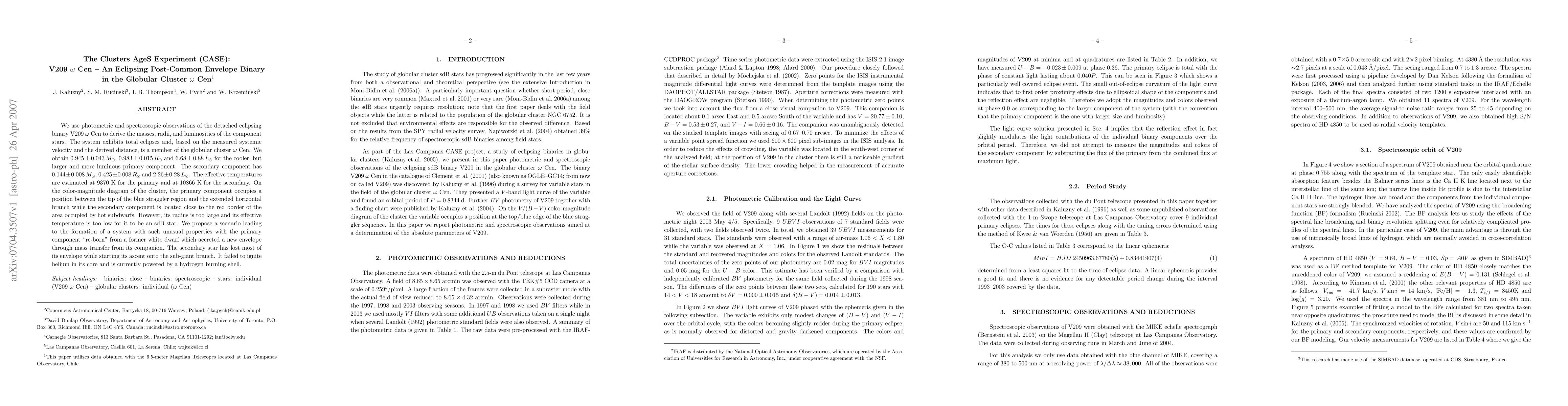 We use photometric and spectroscopic observations of the detached eclipsing binary V209 omega Cen to derive the masses, radii, and luminosities of the component stars. The system exhibits total eclipses and, based on the measured systemic velocity and the derived distance, is a member of the globular cluster omega Cen. We obtain 0.945 +/- 0.043 Msun, 0.983 +/- 0.015 Rsun and 6.68 +/- 0.88 Lsun for the cooler, but larger and more luminous primary component. The secondary component has 0.144 +/- 0.008 Msun, 0.425 +/- 0.008 Rsun and 2.26 +/- 0.28 Lsun. The effective temperatures are estimated at 9370 K for the primary and at 10866 K for the secondary. On the color-magnitude diagram of the cluster, the primary component occupies a position between the tip of the blue straggler region and the extended horizontal branch while the secondary component is located close to the red border of the area occupied by hot subdwarfs. However, its radius is too large and its effective temperature is too low for it to be an sdB star. We propose a scenario leading to the formation of a system with such unusual properties with the primary component ``re-born'' from a former white dwarf which accreted a new envelope through mass transfer from its companion. The secondary star has lost most of its envelope while starting its ascent onto the sub-giant branch. It failed to ignite helium in its core and is currently powered by a hydrogen burning shell.