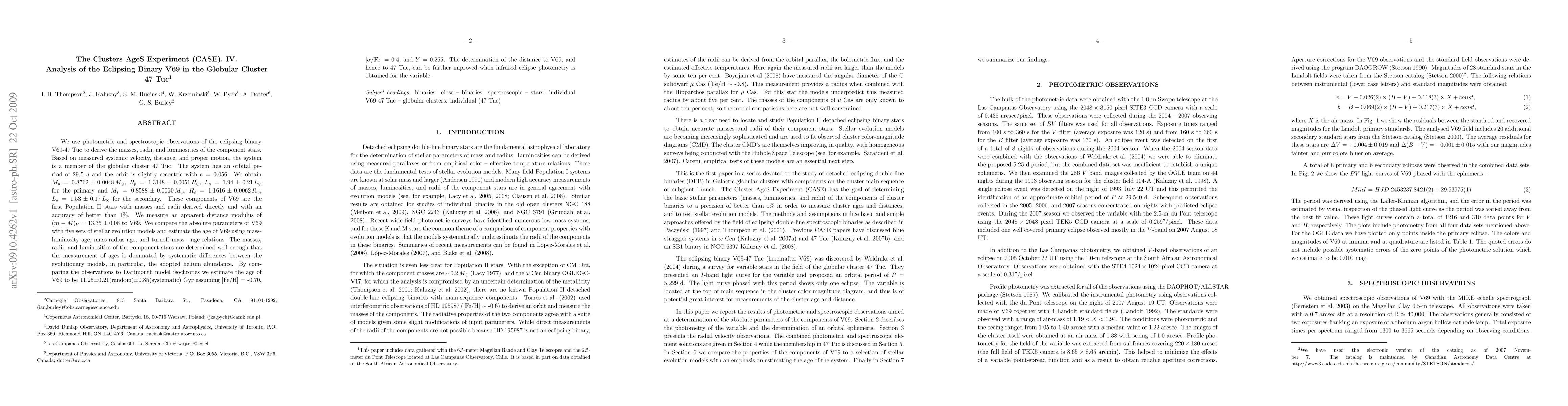 We use photometric and spectroscopic observations of the eclipsing binary V69-47 Tuc to derive the masses, radii, and luminosities of the component stars. Based on measured systemic velocity, distance, and proper motion, the system is a member of the globular cluster 47 Tuc. The system has an orbital period of 29.5 d and the orbit is slightly eccentric with e=0.056. We obtain Mp=0.8762 +- 0.0048 M(Sun), Rp=1.3148 +-0.0051 R(Sun), Lp=1.94 +- 0.21 L(Sun) for the primary and Ms=0.8588 +- 0.0060 M(Sun), Rs=1.1616 +- 0.0062 R(Sun), Ls=1.53 +- 0.17 L(Sun) for the secondary. These components of V69 are the first Population II stars with masses and radii derived directly and with an accuracy of better than 1%. We measure an apparent distance modulus of (m-M)v=13.35 +- 0.08 to V69. We compare the absolute parameters of V69 with five sets of stellar evolution models and estimate the age of V69 using mass-luminosity-age, mass-radius-age, and turnoff mass - age relations. The masses, radii, and luminosities of the component stars are determined well enough that the measurement of ages is dominated by systematic differences between the evolutionary models, in particular, the adopted helium abundance. By comparing the observations to Dartmouth model isochrones we estimate the age of V69 to be 11.25 +- 0.21(random) +- 0.85(systematic) Gyr assuming [Fe/H]=-0.70, [alpha/Fe]=0.4, and Y=0.255. The determination of the distance to V69, and hence to 47Tuc, can be further improved when infrared eclipse photometry is obtained for the variable.