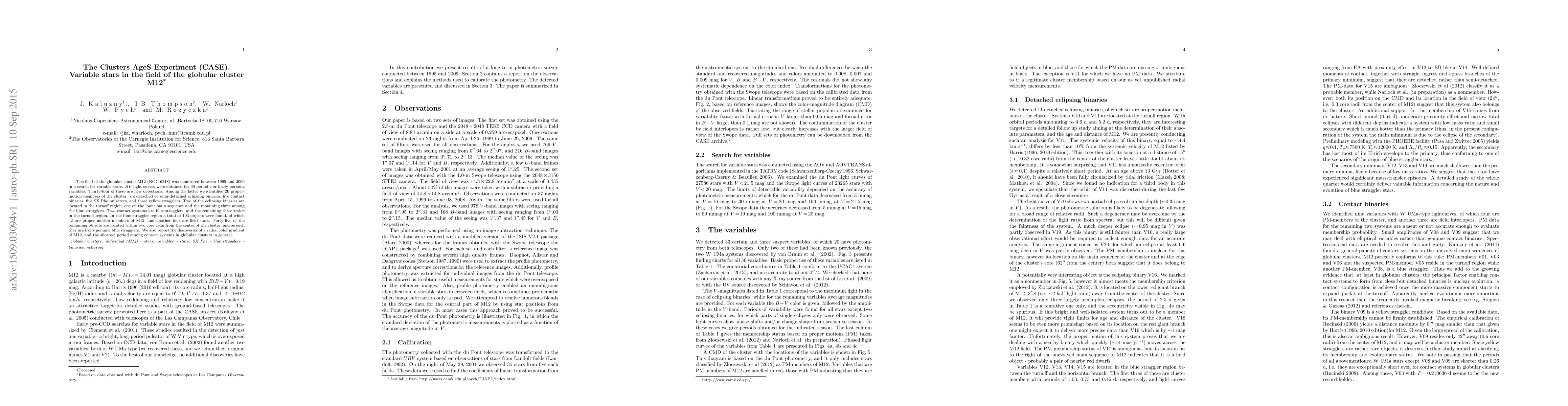 The Clusters AgeS Experiment (CASE) identified 36 variable stars in the globular cluster M12, including 34 new detections, with 20 confirmed as proper-motion members. The study discovered a radial color gradient and the shortest period among contact systems in globular clusters.