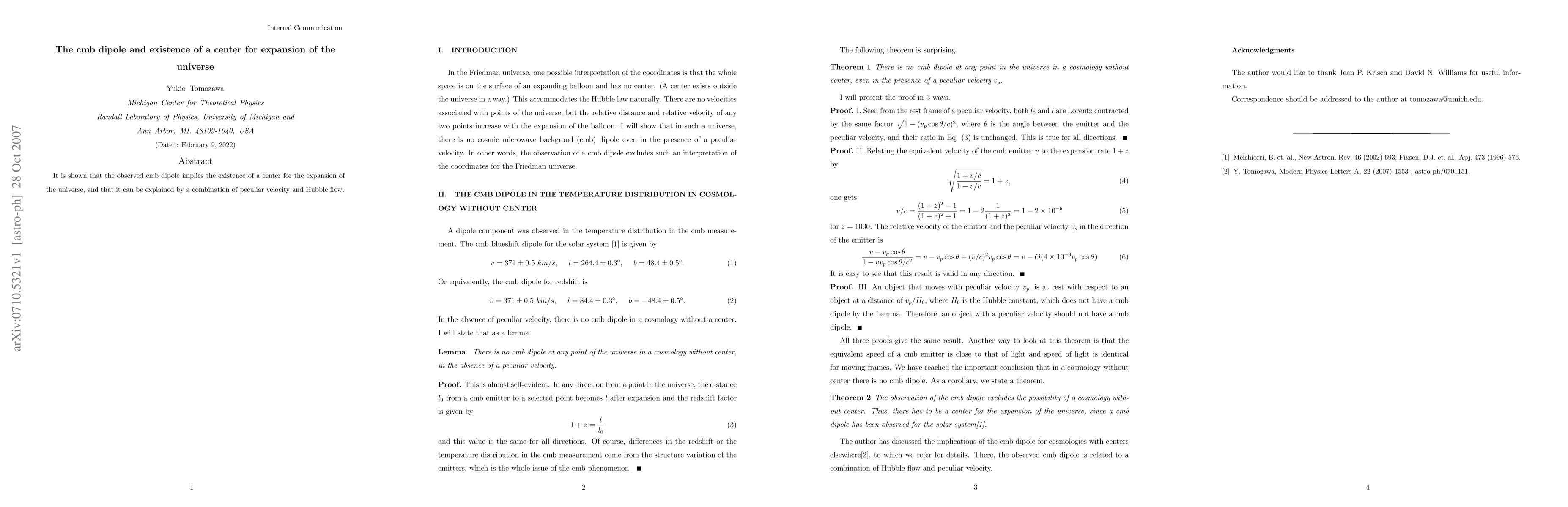 Summary: The paper demonstrates that the cosmic microwave background (CMB) dipole suggests a center for the universe's expansion, attributable to a combination of peculiar velocity and the Hubble flow. This finding challenges the traditional view of an isotropic expansion.