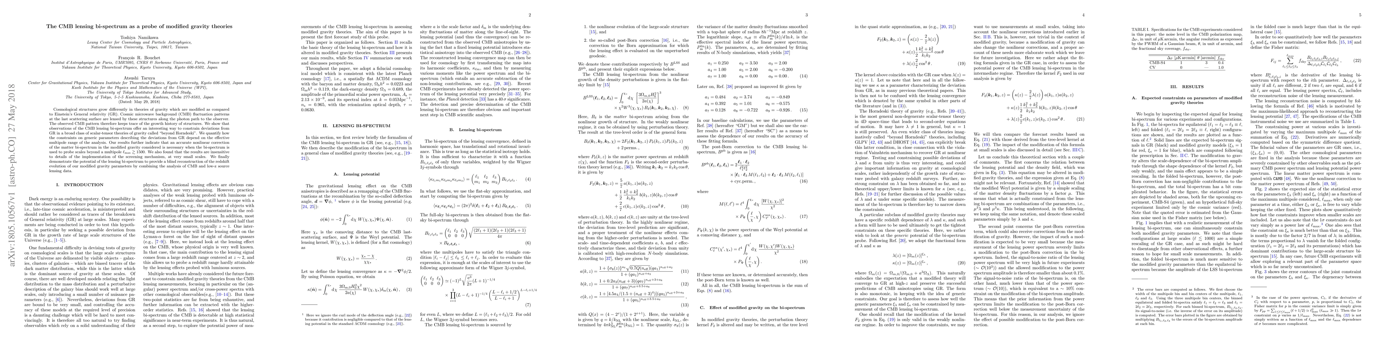 This paper explores how the CMB lensing bi-spectrum can be used to probe deviations from General Relativity in modified gravity theories, specifically scalar-tensor theories beyond Horndeski. It finds that accurate nonlinear corrections are necessary for probing scales beyond a multipole $\ell_{\rm max} \gtrsim 1500$.