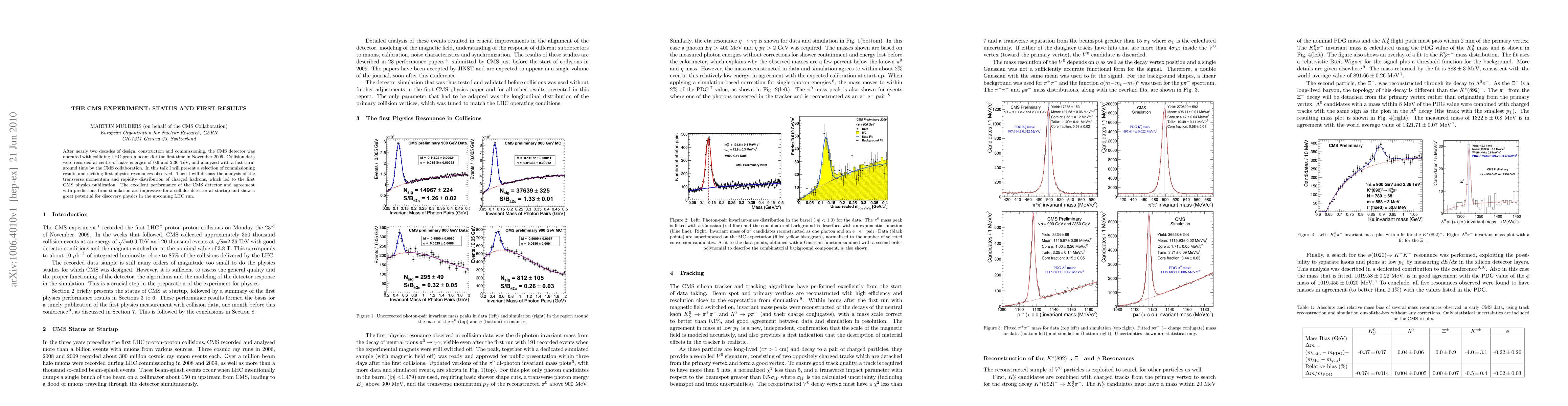 The CMS experiment utilized colliding LHC proton beams, collecting data at center-of-mass energies of 0.9 and 2.36 TeV. The performance of the CMS detector was assessed through commissioning results and first physics resonances observed.