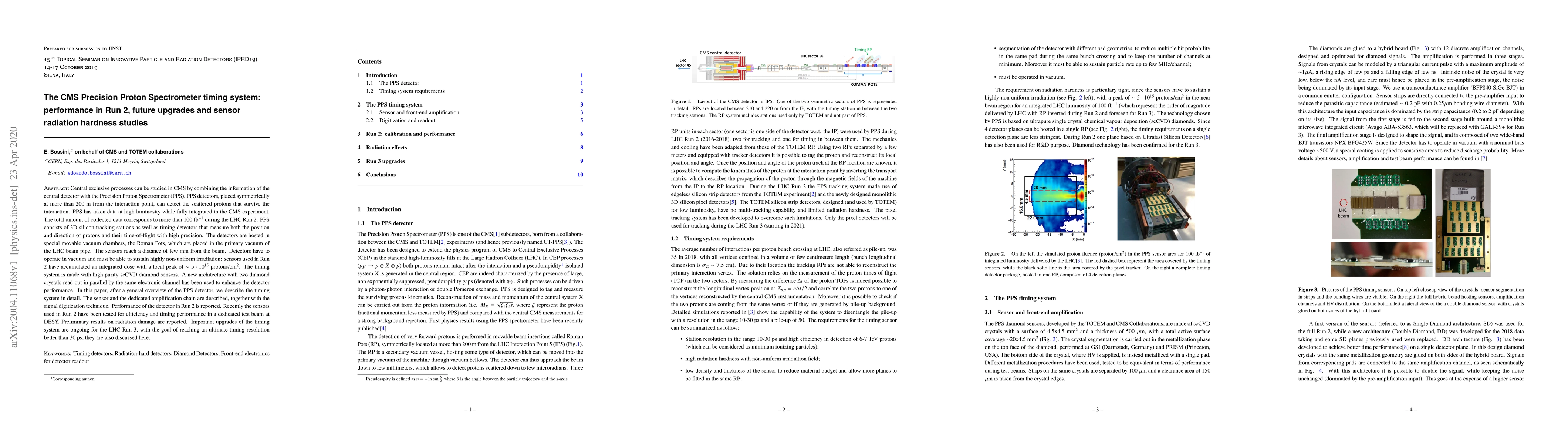 This paper details the performance of the CMS Precision Proton Spectrometer's timing system during LHC Run 2, highlighting its high-precision measurements of proton position and time-of-flight. It also discusses future upgrades and preliminary radiation hardness studies for sensor materials, aiming for improved timing resolution in Run 3.