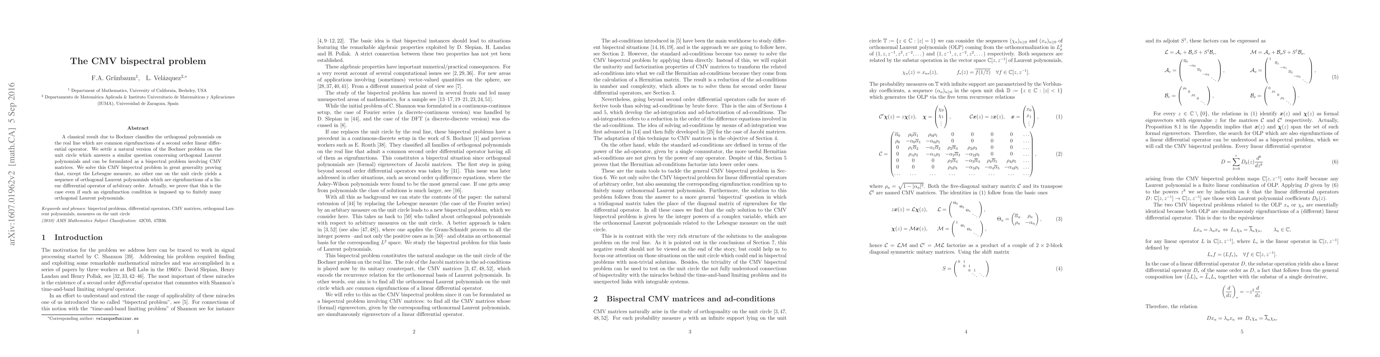 A classical result due to Bochner classifies the orthogonal polynomials on the real line which are common eigenfunctions of a second order linear differential operator. We settle a natural version of the Bochner problem on the unit circle which answers a similar question concerning orthogonal Laurent polynomials and can be formulated as a bispectral problem involving CMV matrices. We solve this CMV bispectral problem in great generality proving that, except the Lebesgue measure, no other one on the unit circle yields a sequence of orthogonal Laurent polynomials which are eigenfunctions of a linear differential operator of arbitrary order. Actually, we prove that this is the case even if such an eigenfunction condition is imposed up to finitely many orthogonal Laurent polynomials.