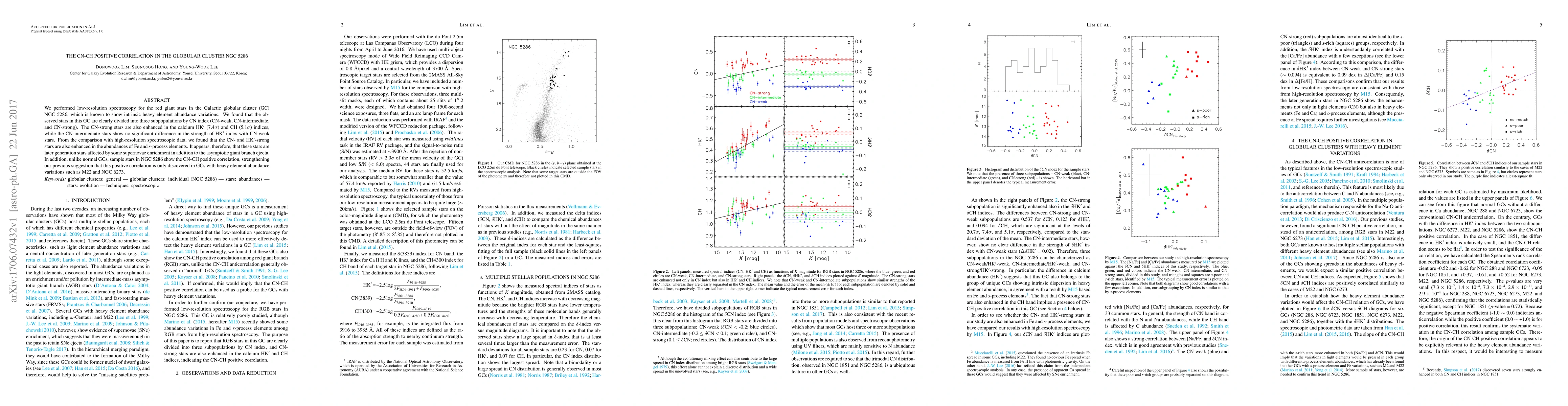 The study of NGC 5286 globular cluster reveals three subpopulations of red giant stars with varying CN indices, showing enhanced abundances of certain elements, particularly a positive correlation between CN and CH.