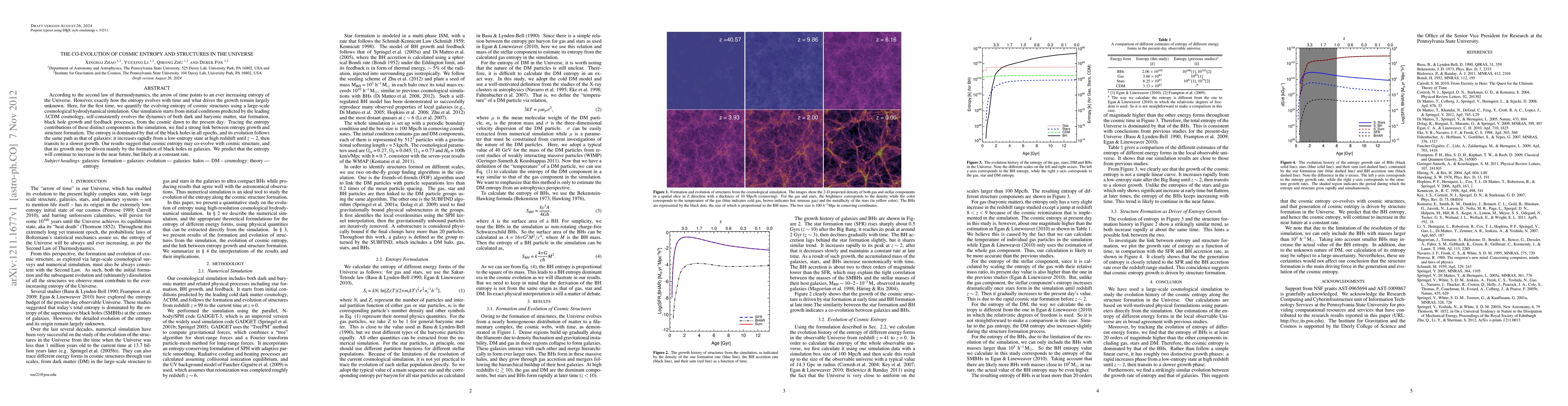 This paper quantifies the evolving entropy of cosmic structures through a large-scale cosmological simulation, finding that entropy growth is strongly linked to structure formation, primarily driven by black hole growth in galaxies. The entropy increases rapidly until z~2, then transitions to slower growth, suggesting a future constant rate of entropy increase.