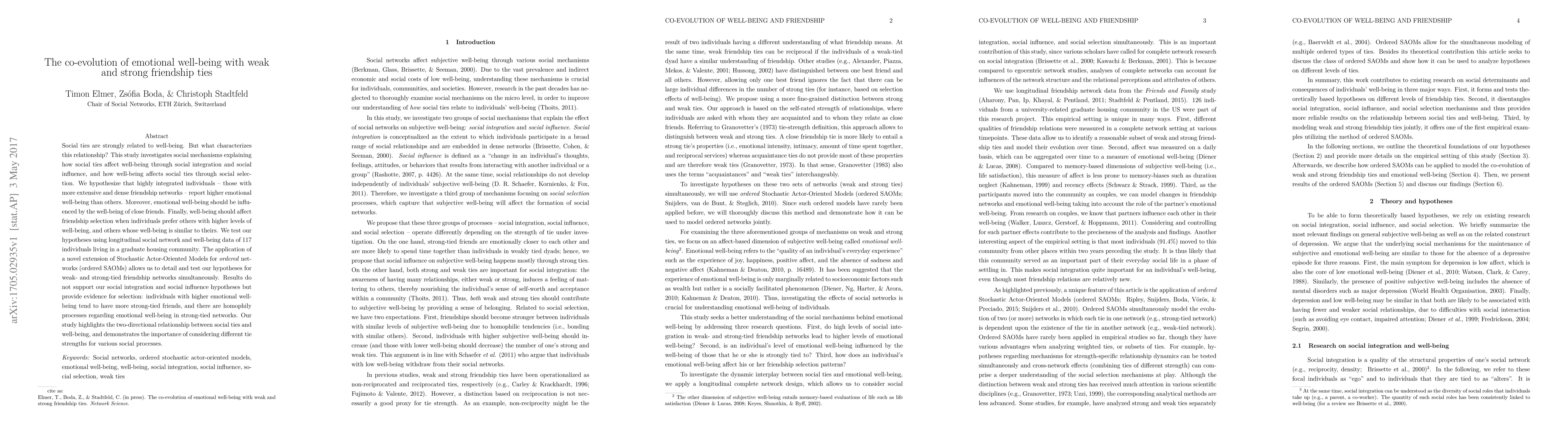 This study explores the co-evolution of emotional well-being with both weak and strong friendship ties, finding that while social integration and influence do not significantly affect well-being, individuals with higher well-being tend to select stronger friendships, and there is a homophily effect in these strong-tie networks. The research underscores the importance of considering different tie strengths in social processes.