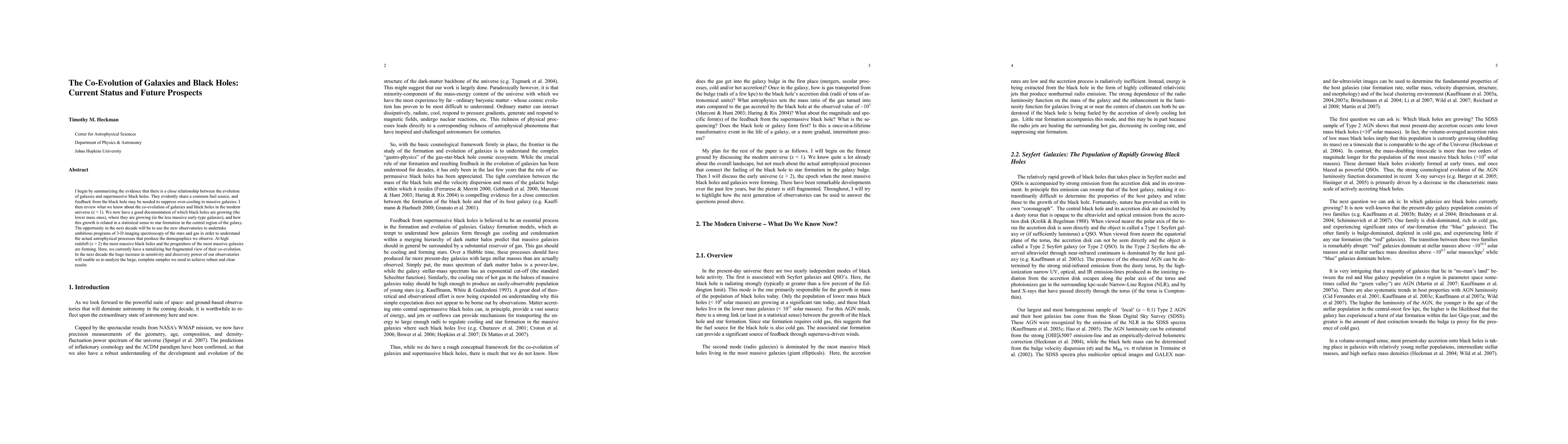 I begin by summarizing the evidence that there is a close relationship between the evolution of galaxies and supermassive black holes. They evidently share a common fuel source, and feedback from the black hole may be needed to suppress over-cooling in massive galaxies. I then review what we know about the co-evolution of galaxies and black holes in the modern universe (z < 1). We now have a good documentation of which black holes are growing (the lower mass ones), where they are growing (in the less massive early-type galaxies), and how this growth is related in a statistical sense to star formation in the central region of the galaxy. The opportunity in the next decade will be to use the new observatories to undertake ambitious programs of 3-D imaging spectroscopy of the stars and gas in order to understand the actual astrophysical processes that produce the demographics we observe. At high redshift (z > 2) the most massive black holes and the progenitors of the most massive galaxies are forming. Here, we currently have a tantalizing but fragmented view of their co-evolution. In the next decade the huge increase in sensitivity and discovery power of our observatories will enable us to analyze the large, complete samples we need to achieve robust and clear results.