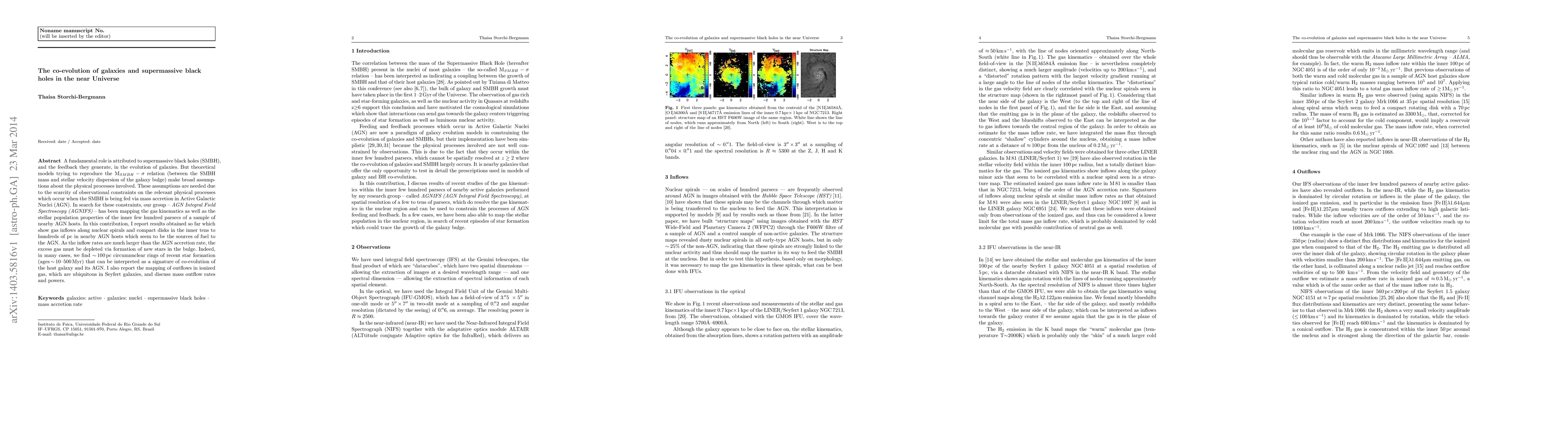 This paper investigates the co-evolution of galaxies and supermassive black holes (SMBH) in nearby Active Galactic Nuclei (AGN) hosts, revealing gas inflows fueling the AGN and star formation in circumnuclear rings. These findings suggest a close relationship between SMBH activity and galaxy bulge evolution.
