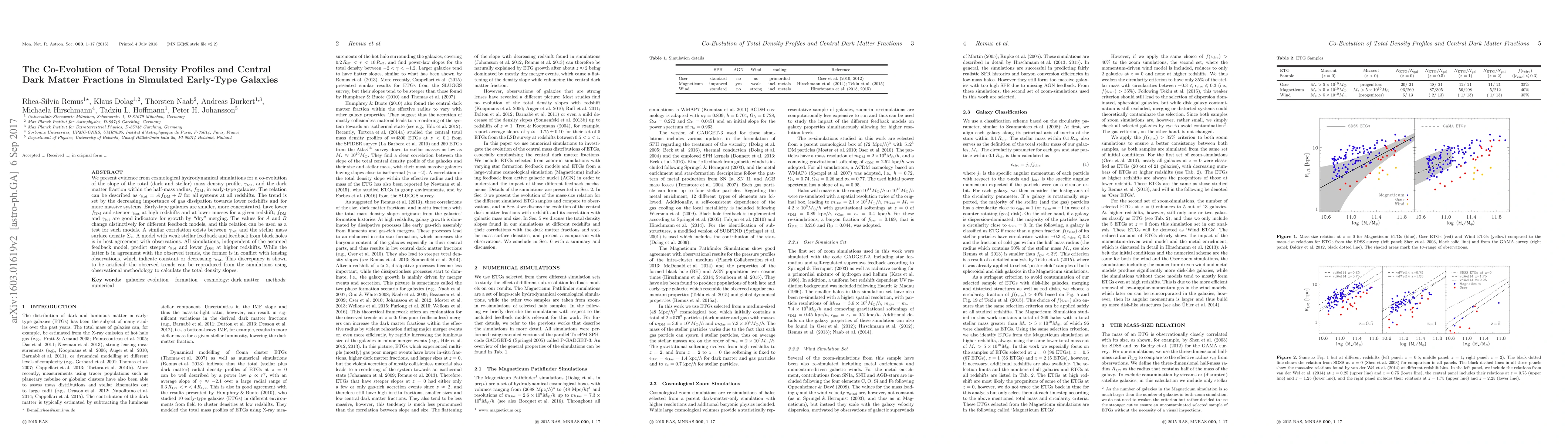 We present evidence from cosmological hydrodynamical simulations for a co-evolution of the slope of the total (dark and stellar) mass density profile, gamma_tot, and the dark matter fraction within the half-mass radius, f_DM, in early-type galaxies. The relation can be described as gamma_tot = A f_DM + B for all systems at all redshifts. The trend is set by the decreasing importance of gas dissipation towards lower redshifts and for more massive systems. Early-type galaxies are smaller, more concentrated, have lower f_DM and steeper gamma_tot at high redshifts and at lower masses for a given redshift; f_DM and gamma_tot are good indicators for growth by "dry" merging. The values for A and B change distinctively for different feedback models, and this relation can be used as a test for such models. A similar correlation exists between gamma_tot and the stellar mass surface density Sigma_*. A model with weak stellar feedback and feedback from black holes is in best agreement with observations. All simulations, independent of the assumed feedback model, predict steeper gamma_tot and lower f_DM at higher redshifts. While the latter is in agreement with the observed trends, the former is in conflict with lensing observations, which indicate constant or decreasing gamma_tot. This discrepancy is shown to be artificial: the observed trends can be reproduced from the simulations using observational methodology to calculate the total density slopes.