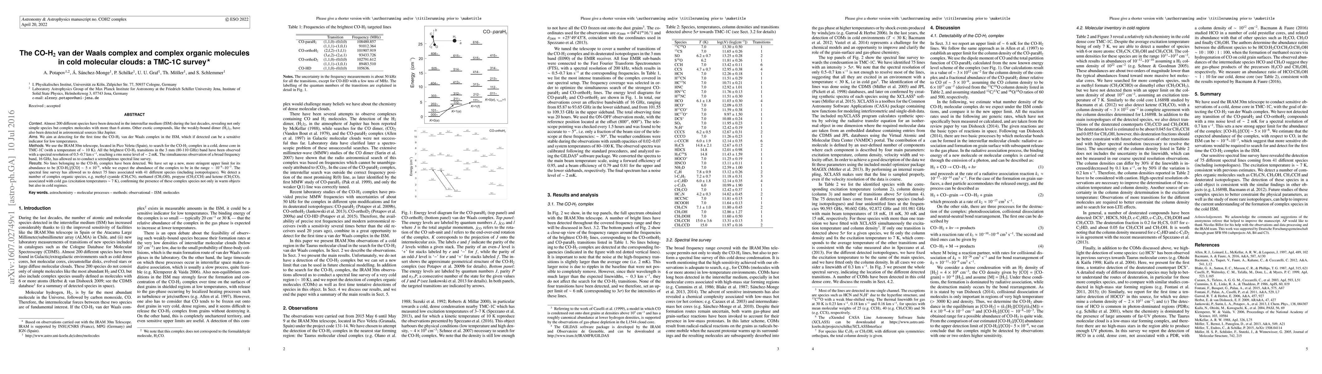 Researchers used a 30m telescope to search for CO-H2 van der Waals complex in a cold molecular cloud, detecting over 75 lines of complex organic molecules instead, setting an upper limit for the complex's abundance.