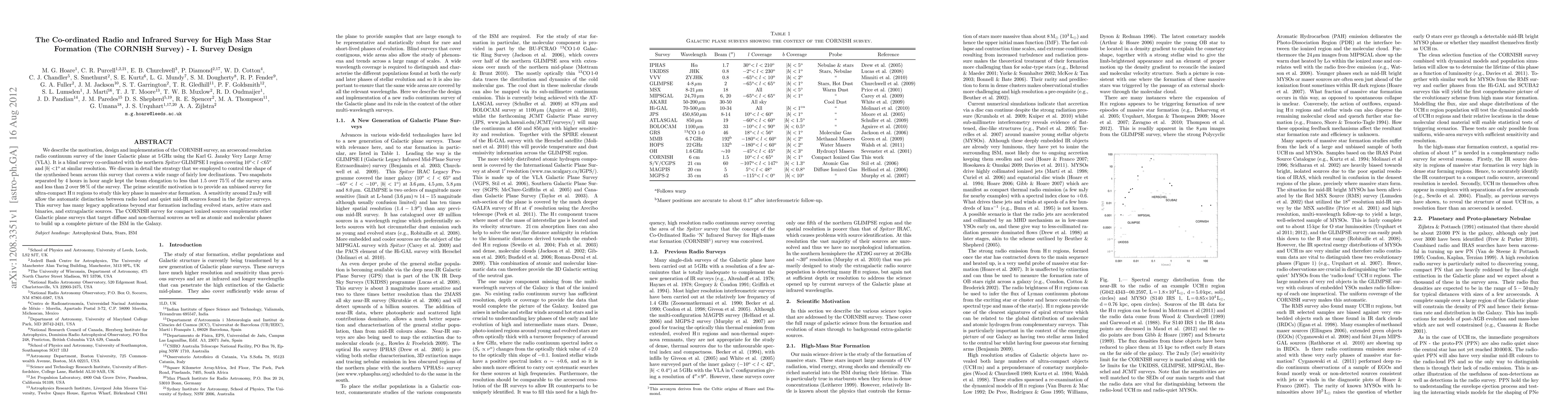 The CORNISH Survey is an arcsecond resolution radio continuum survey at 5 GHz using the VLA, coordinated with the Spitzer GLIMPSE I region, aiming to study ultra-compact HII regions and massive star formation. The survey maintains beam shape consistency across a wide range of declinations, achieving sensitivity around 2 mJy to distinguish radio-loud and quiet mid-IR sources.