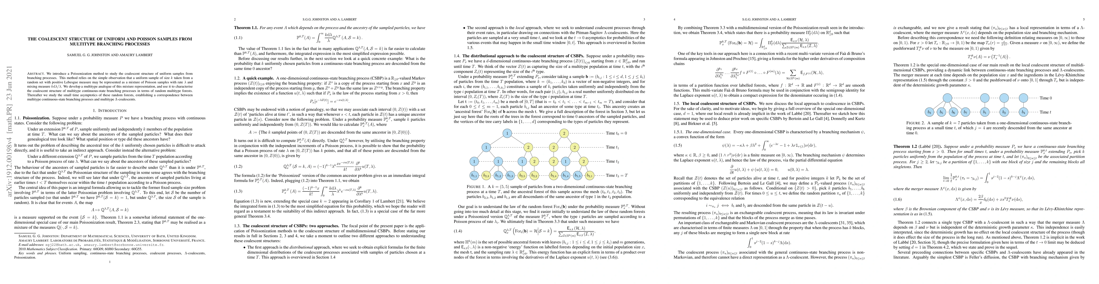We introduce a Poissonization method to study the coalescent structure of uniform samples from branching processes. This method relies on the simple observation that a uniform sample of size $k$ taken from a random set with positive Lebesgue measure may be represented as a mixture of Poisson samples with rate $\lambda$ and mixing measure $k \mathrm{d} \lambda/ \lambda$. We develop a multitype analogue of this mixture representation, and use it to characterise the coalescent structure of multitype continuous-state branching processes in terms of random multitype forests. Thereafter we study the small time asymptotics of these random forests, establishing a correspondence between multitype continuous-state branching proesses and multitype $\Lambda$-coalescents.