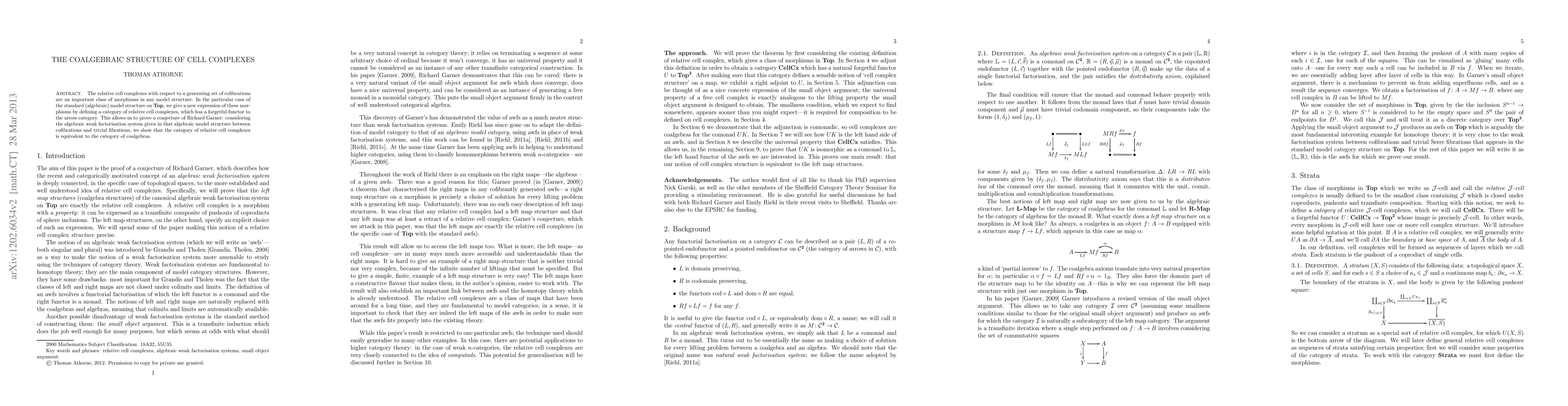 The paper introduces a new category of relative cell complexes in the context of algebraic model structures on topological spaces, establishing an equivalence between this category and the category of coalgebras, thereby proving a conjecture by Richard Garner. This reveals a coalgebraic structure underlying relative cell complexes.