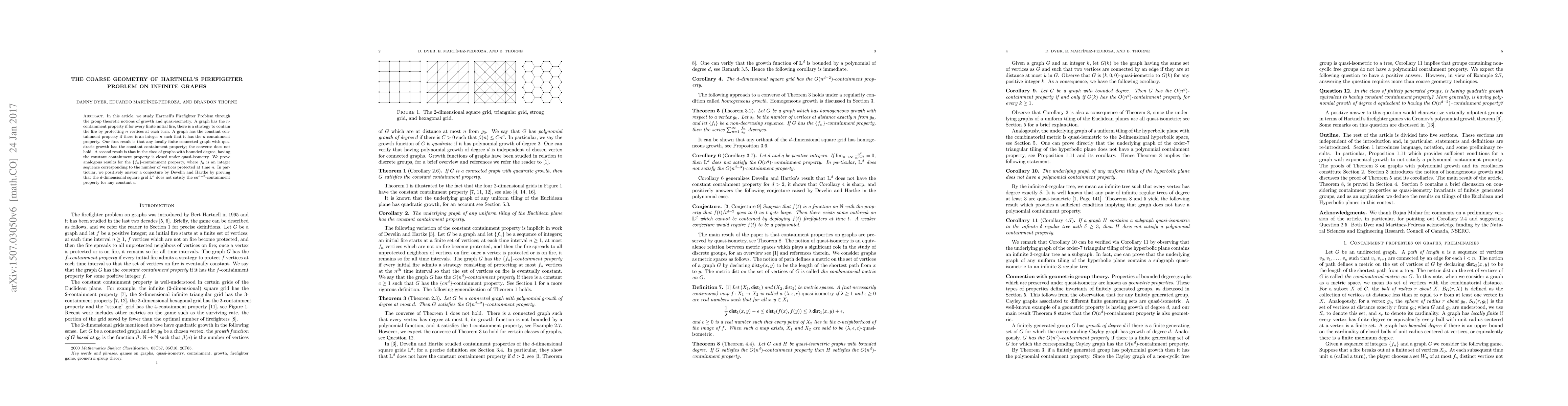 In this article, we study Hartnell's Firefighter Problem through the group theoretic notions of growth and quasi-isometry. A graph has the $n$-containment property if for every finite initial fire, there is a strategy to contain the fire by protecting $n$ vertices at each turn. A graph has the constant containment property if there is an integer $n$ such that it has the $n$-containment property. Our first result is that any locally finite connected graph with quadratic growth has the constant containment property; the converse does not hold. This result provides a unified way to recover previous results in the literature, in particular the class of graphs satisfying the constant containment property is infinite. A second result is that in the class of graphs with bounded degree, having the constant containment property is preserved by quasi-isometry. Some sample consequences of the second result are that any regular tiling of the Euclidean plane has the fire containment property; no regular tiling of the $n$-dimensional Euclidean space has the containment property if $n>2$; and no regular tiling of the $n$-dimensional hyperbolic space has the containment property if $n\geq 2$. We prove analogous results for the $\{f_n\}$-containment property, where $f_n$ is an integer sequence corresponding to the number of vertices protected at time $n$. In particular, we positively answer a conjecture by Develin and Hartke by proving that the $d$-dimensional square grid $\mathbb{L}^d$ does not satisfy the $cn^{d-3}$-containment property for any constant $c$.