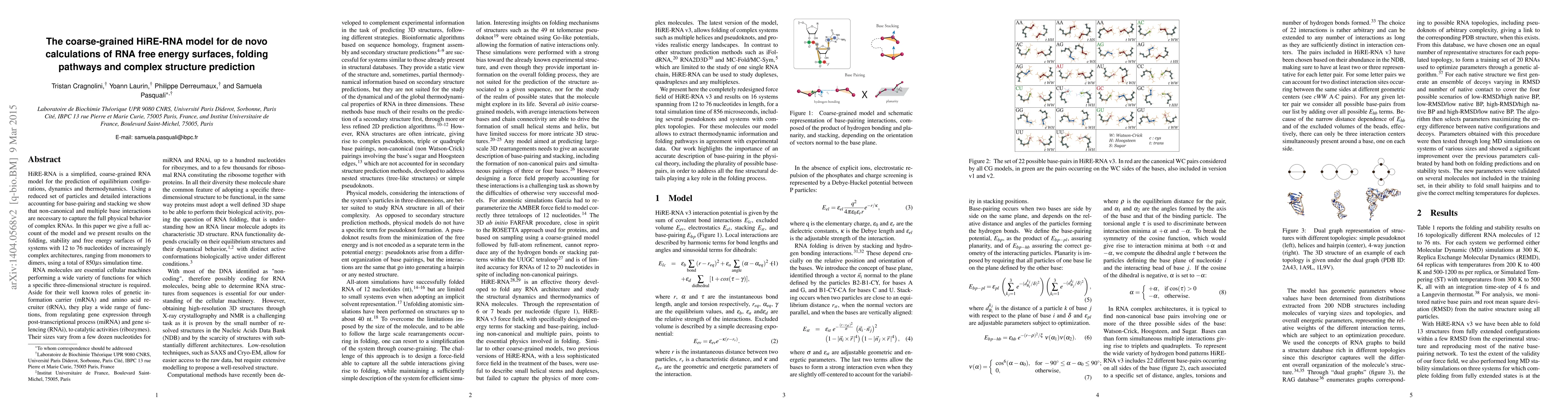 HiRE-RNA is a simplified, coarse-grained RNA model for the prediction of equilibrium configurations, dynamics and thermodynamics. Using a reduced set of particles and detailed interactions accounting for base-pairing and stacking we show that non-canonical and multiple base interactions are necessary to capture the full physical behavior of complex RNAs. In this paper we give a full account of the model and we present results on the folding, stability and free energy surfaces of 16 systems with 12 to 76 nucleotides of increasingly complex architectures, ranging from monomers to dimers, using a total of 850$\mu$s simulation time.