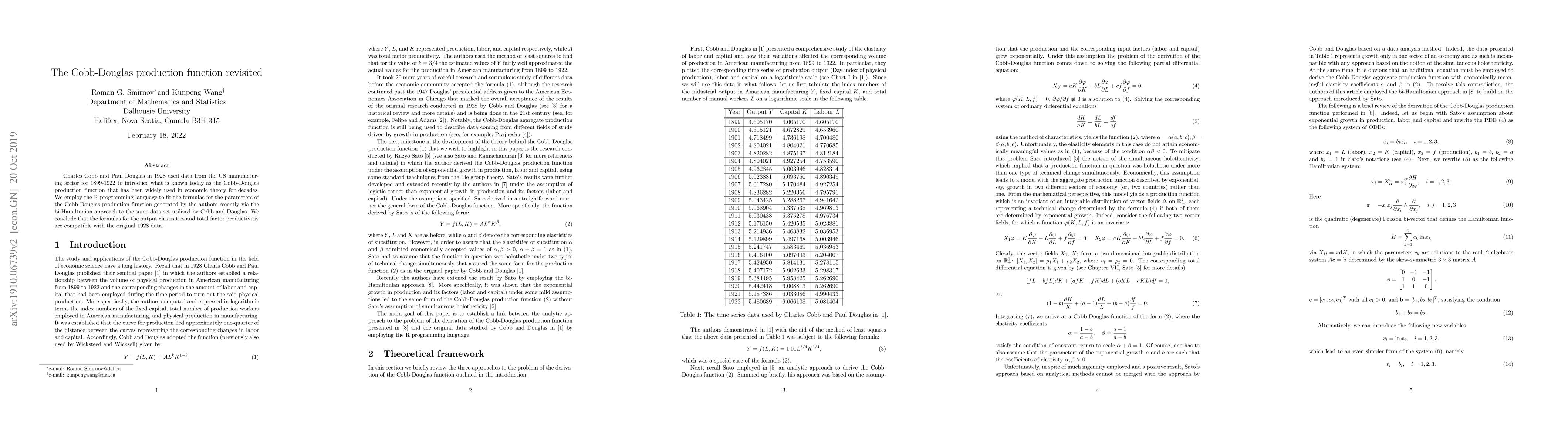 Researchers revisited the 1928 Cobb-Douglas production function using new methods, finding compatible results with original data on US manufacturing sector from 1899-1922. The study confirms the formulas for output elasticities and total factor productivity remain valid.