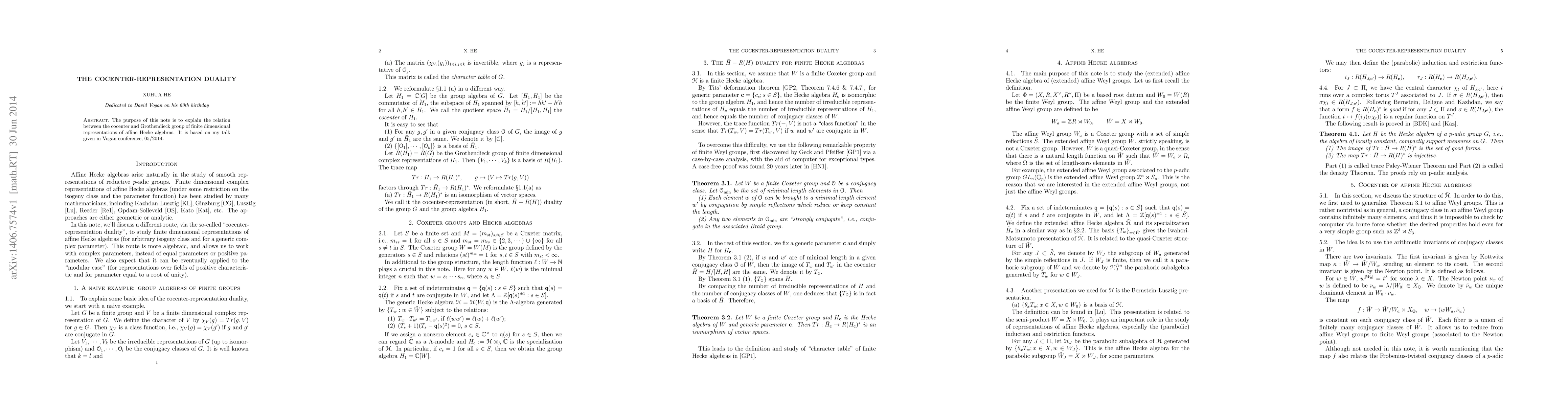 Affine Hecke algebras arise naturally in the study of smooth representations of reductive $p$-adic groups. Finite dimensional complex representations of affine Hecke algebras (under some restriction on the isogeny class and the parameter function) has been studied by many mathematicians, including Kazhdan-Lusztig \cite{KL}, Ginzburg \cite{CG}, Lusztig \cite{L1}, Reeder \cite{Re}, Opdam-Solleveld \cite{OS}, Kato \cite{Kat}, etc. The approaches are either geometric or analytic. In this note, we'll discuss a different route, via the so-called "cocenter-representation duality", to study finite dimensional representations of affine Hecke algebras (for arbitrary isogeny class and for a generic complex parameter). This route is more algebraic, and allows us to work with complex parameters, instead of equal parameters or positive parameters. We also expect that it can be eventually applied to the "modular case" (for representations over fields of positive characteristic and for parameter equal to a root of unity).
