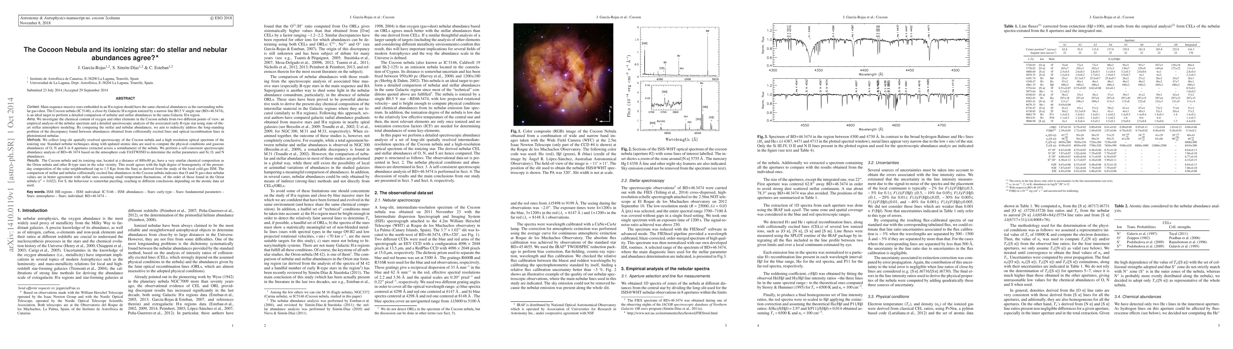 This study compares the chemical abundances of O, N, and S in the Cocoon nebula with those of its ionizing B0.5 V star, BD+46 3474. The findings suggest that stellar and nebular abundances are in good agreement, supporting the homogeneity of the solar neighborhood's composition and indicating that discrepancies in previous nebular abundance studies may be due to temperature fluctuations.