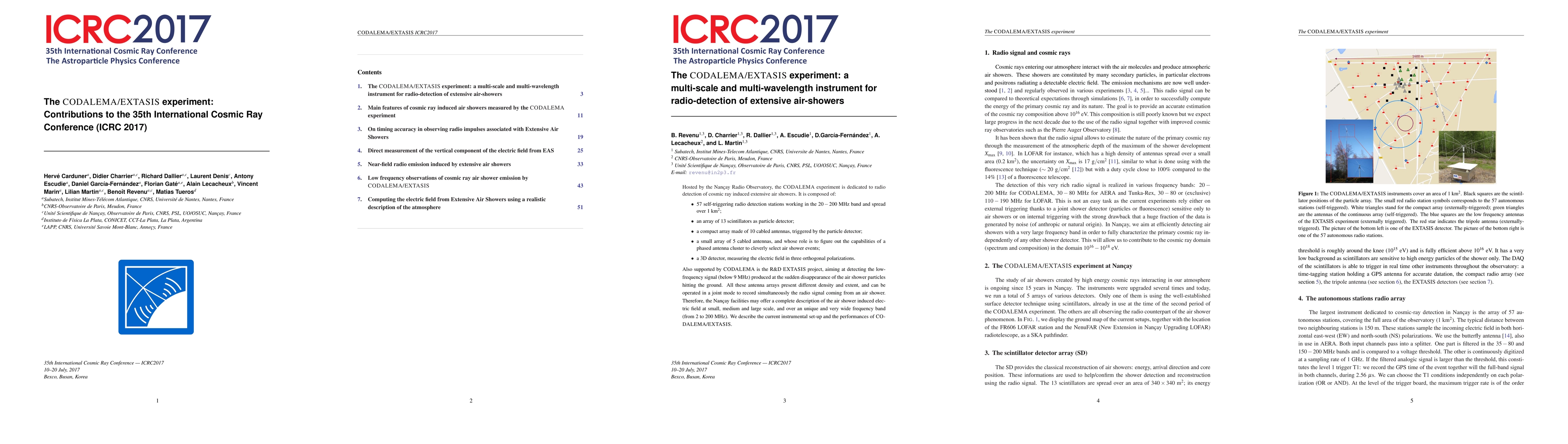 Summary: The CODALEMA/EXTASIS experiment presented findings at the 35th International Cosmic Ray Conference (ICRC 2017) in Busan, South Korea, contributing to the understanding of cosmic ray phenomena and advancing research in high-energy astrophysics. The results highlighted significant advancements in the detection and analysis of cosmic rays.