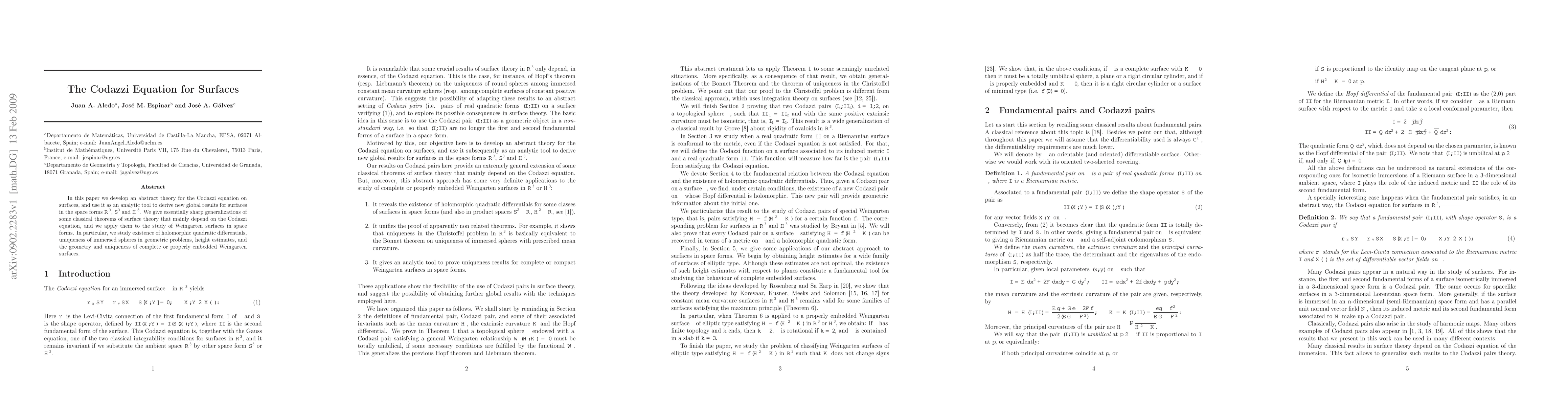 In this paper we develop an abstract theory for the Codazzi equation on surfaces, and use it as an analytic tool to derive new global results for surfaces in the space forms ${\bb R}^3$, ${\bb S}^3$ and ${\bb H}^3$. We give essentially sharp generalizations of some classical theorems of surface theory that mainly depend on the Codazzi equation, and we apply them to the study of Weingarten surfaces in space forms. In particular, we study existence of holomorphic quadratic differentials, uniqueness of immersed spheres in geometric problems, height estimates, and the geometry and uniqueness of complete or properly embedded Weingarten surfaces.