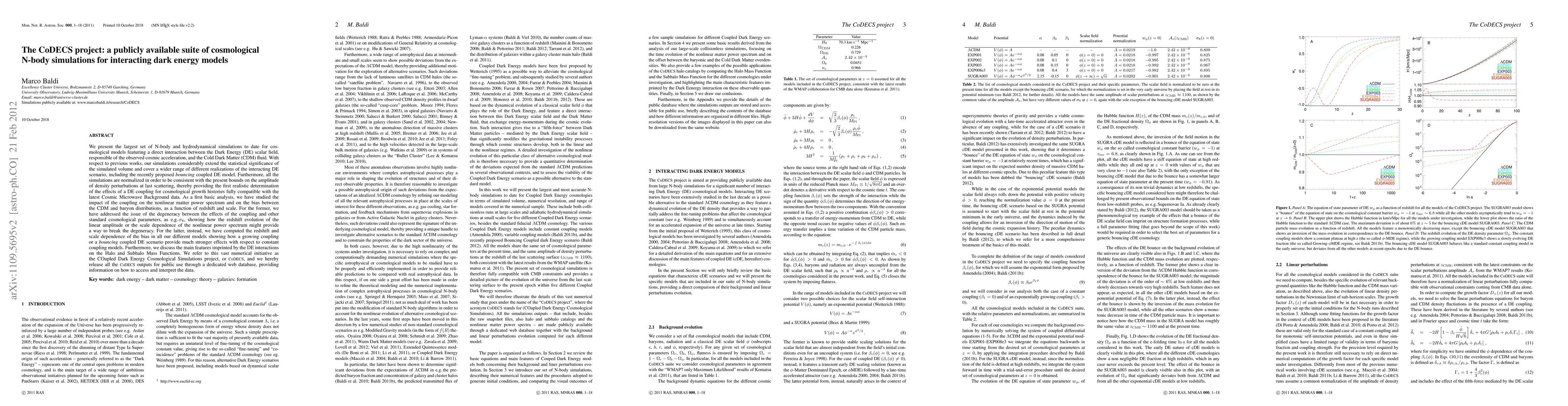 We present the largest set of N-body and hydrodynamical simulations to date for cosmological models featuring a direct interaction between the Dark Energy (DE) scalar field, responsible of the observed cosmic acceleration, and the Cold Dark Matter (CDM) fluid. With respect to previous works, our simulations considerably extend the statistical significance of the simulated volume and cover a wider range of different realizations of the interacting DE scenario, including the recently proposed bouncing coupled DE model. Furthermore, all the simulations are normalized in order to be consistent with the present bounds on the amplitude of density perturbations at last scattering, thereby providing the first realistic determination of the effects of a DE coupling for cosmological growth histories fully compatible with the latest Cosmic Microwave Background data. As a first basic analysis, we have studied the impact of the coupling on the nonlinear matter power spectrum and on the bias between the CDM and baryon distributions, as a function of redshift and scale. For the former, we have addressed the issue of the degeneracy between the effects of the coupling and other standard cosmological parameters, as e.g sigma_8, showing how the redshift evolution of the linear amplitude or the scale dependence of the nonlinear power spectrum might provide a way to break the degeneracy. For the latter, instead, we have computed the redshift and scale dependence of the bias in all our different models showing how a growing coupling or a bouncing coupled DE scenario provide much stronger effects with respect to constant coupling models. We refer to this vast numerical initiative as the COupled Dark Energy Cosmological Simulations project, or CoDECS, and we hereby release all the CoDECS outputs for public use through a dedicated web database, providing information on how to access and interpret the data.
