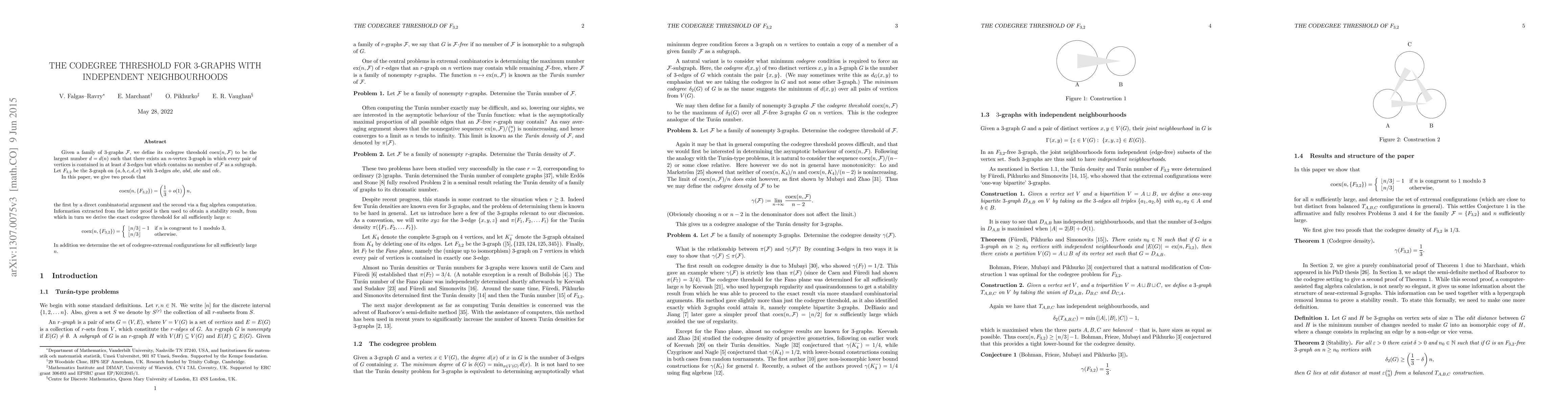Given a family of 3-graphs $F$, we define its codegree threshold $\mathrm{coex}(n, F)$ to be the largest number $d=d(n)$ such that there exists an $n$-vertex 3-graph in which every pair of vertices is contained in at least $d$ 3-edges but which contains no member of $F$ as a subgraph. Let $F_{3,2}$ be the 3-graph on $\{a,b,c,d,e\}$ with 3-edges $\{abc,abd,abe,cde\}$. In this paper, we give two proofs that $\mathrm{coex}(n, F_{3,2})= n/3 +o(n)$, the first by a direct combinatorial argument and the second via a flag algebra computation. Information extracted from the latter proof is then used to obtain a stability result, from which in turn we derive the exact codegree threshold for all sufficiently large $n$: $\mathrm{coex}(n, F_{3,2})= \lfloor n/3 \rfloor -1$ if $n$ is congruent to $1$ modulo $3$, and $\lfloor n/3 \rfloor$ otherwise. In addition we determine the set of codegree-extremal configurations.