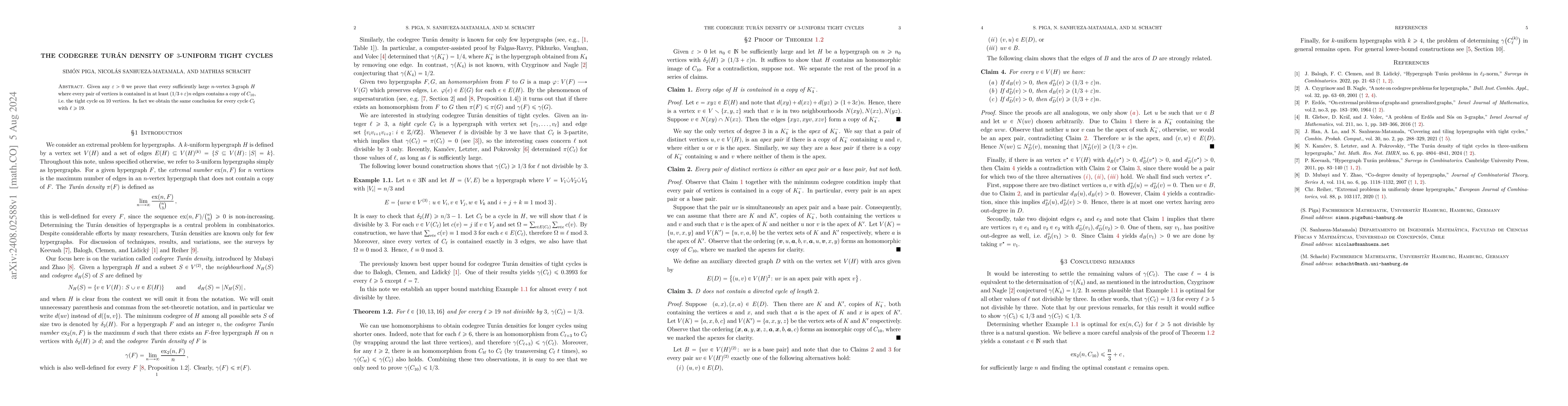 The paper proves that any sufficiently large $3$-uniform hypergraph $H$ with a high edge density between vertex pairs contains a copy of the tight cycle $C_{10}$, and similarly for any cycle $C_\ell$ with $\ell \geq 19$. This establishes the codegree Turán density for these cycles in $3$-uniform hypergraphs.