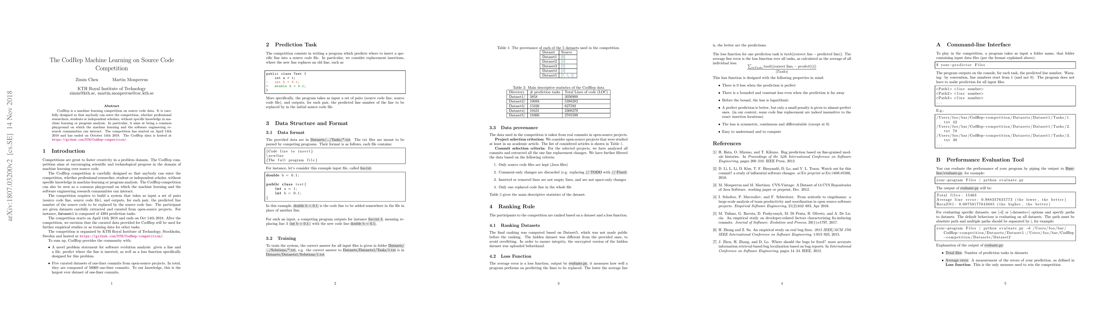 Summary: CodRep is a machine learning competition focused on source code data, designed to be accessible to all participants regardless of their expertise in machine learning or program analysis. It aims to foster interaction between machine learning and software engineering research communities. The competition ran from April to October 2018, with data available on GitHub.