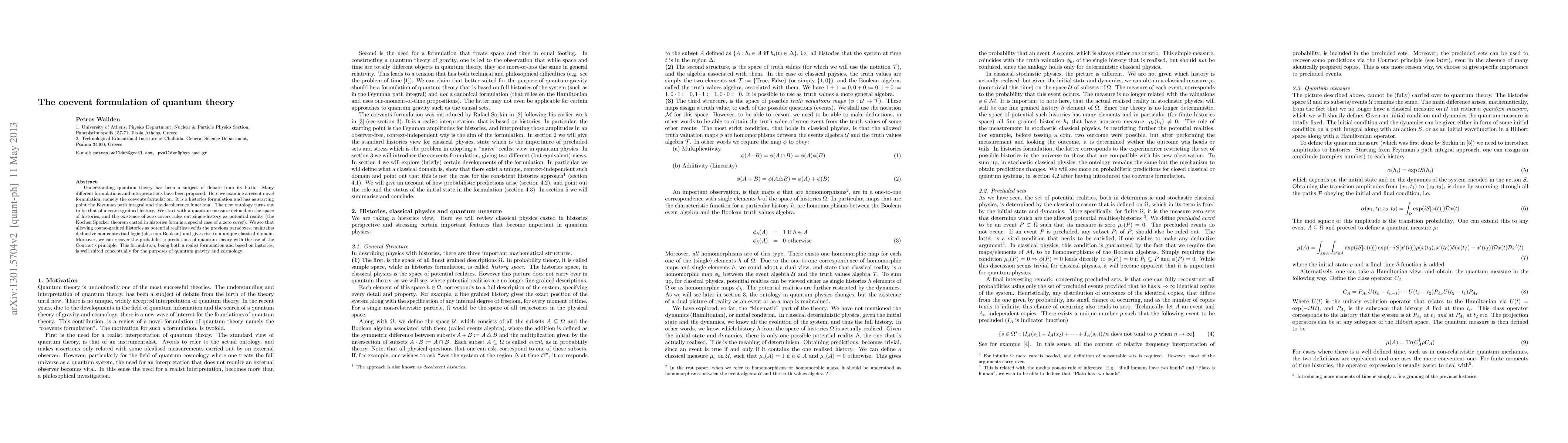 Understanding quantum theory has been a subject of debate from its birth. Many different formulations and interpretations have been proposed. Here we examine a recent novel formulation, namely the coevents formulation. It is a histories formulation and has as starting point the Feynman path integral and the decoherence functional. The new ontology turns out to be that of a coarse-grained history. We start with a quantum measure defined on the space of histories, and the existence of zero covers rules out single-history as potential reality (the Kochen Specker theorem casted in histories form is a special case of a zero cover). We see that allowing coarse-grained histories as potential realities avoids the previous paradoxes, maintains deductive non-contextual logic (alas non-Boolean) and gives rise to a unique classical domain. Moreover, we can recover the probabilistic predictions of quantum theory with the use of the Cournot's principle. This formulation, being both a realist formulation and based on histories, is well suited conceptually for the purposes of quantum gravity and cosmology.