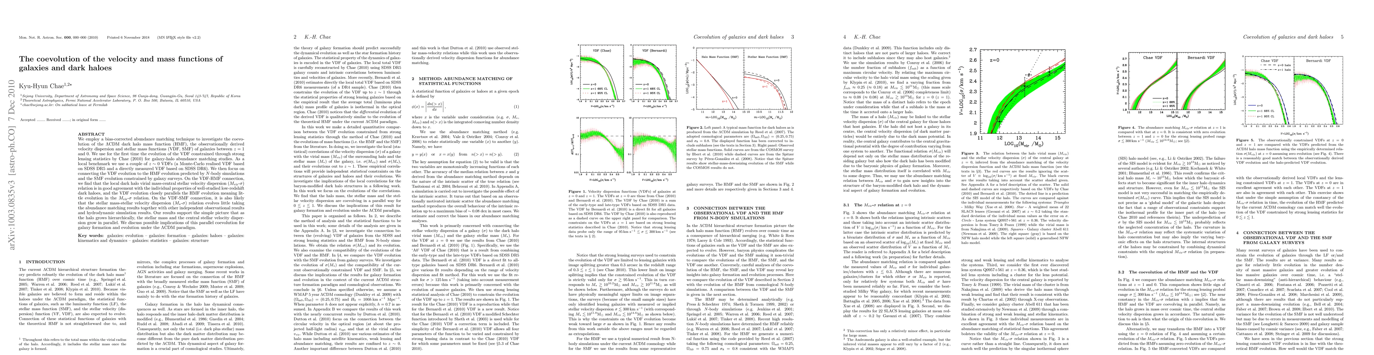 We employ a bias-corrected abundance matching technique to investigate the coevolution of the LCDM dark halo mass function (HMF), the observationally derived velocity dispersion and stellar mass functions (VDF, SMF) of galaxies between z=1 and 0. We use for the first time the evolution of the VDF constrained through strong lensing statistics by Chae (2010) for galaxy-halo abundance matching studies. As a local benchmark we use a couple of z ~ 0 VDFs (a Monte-Carlo realised VDF based on SDSS DR5 and a directly measured VDF based on SDSS DR6). We then focus on connecting the VDF evolution to the HMF evolution predicted by N-body simulations and the SMF evolution constrained by galaxy surveys. On the VDF-HMF connection, we find that the local dark halo virial mass-central stellar velocity dispersion (Mvir-sigma) relation is in good agreement with the individual properties of well-studied low-redshift dark haloes, and the VDF evolution closely parallels the HMF evolution meaning little evolution in the Mvir-sigma relation. On the VDF-SMF connection, it is also likely that the stellar mass-stellar velocity dispersion (Mstar-sigma) relation evolves little taking the abundance matching results together with other independent observational results and hydrodynamic simulation results. Our results support the simple picture that as the halo grows hierarchically, the stellar mass and the central stellar velocity dispersion grow in parallel. We discuss possible implications of this parallel coevolution for galaxy formation and evolution under the LCDM paradigm.