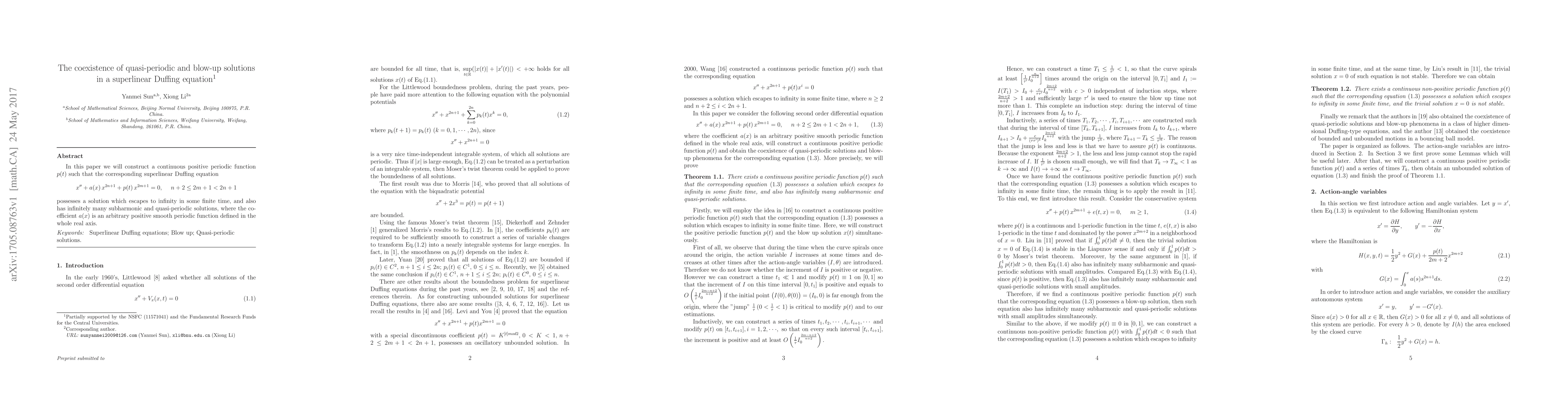 A research paper constructs a superlinear Duffing equation with specific conditions to produce solutions that escape to infinity in finite time and exhibit infinitely many subharmonic and quasi-periodic solutions.