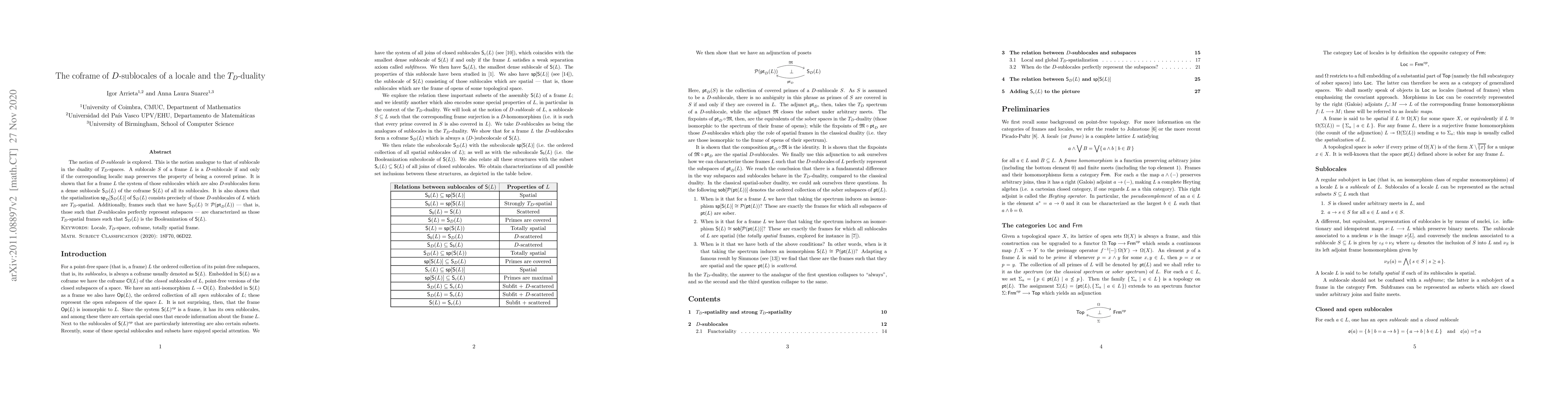 This paper explores D-sublocales, a concept analogous to sublocales in the duality of $T_D$ spaces, showing that they form a dense sublocale within the coframe of all sublocales. It characterizes $T_D$-spatial frames and their perfect representation of subspaces through Booleanization.