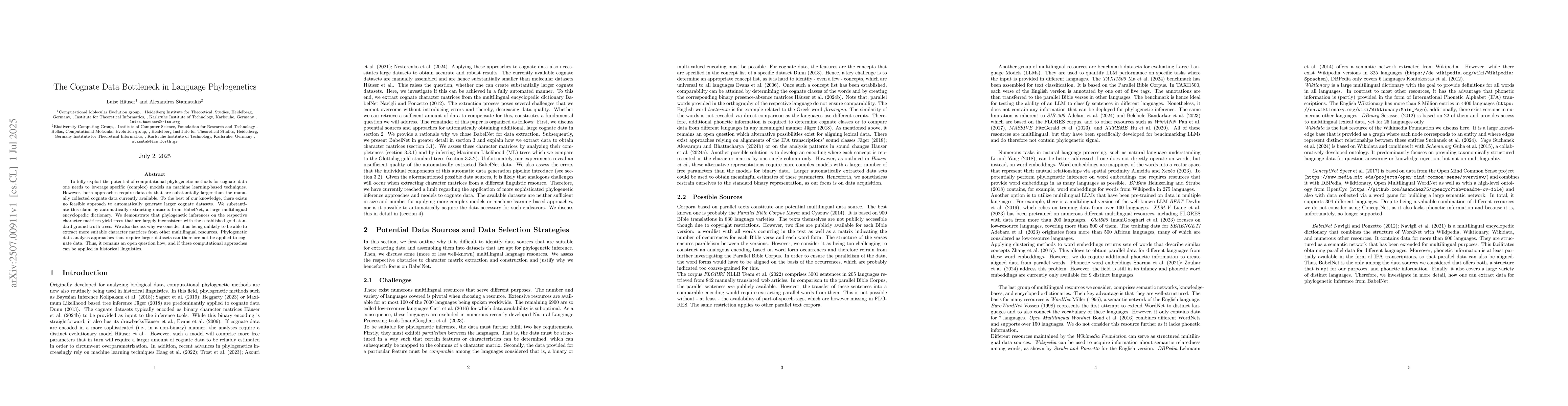 To fully exploit the potential of computational phylogenetic methods for cognate data one needs to leverage specific (complex) models an machine learning-based techniques. However, both approaches require datasets that are substantially larger than the manually collected cognate data currently available. To the best of our knowledge, there exists no feasible approach to automatically generate larger cognate datasets. We substantiate this claim by automatically extracting datasets from BabelNet, a large multilingual encyclopedic dictionary. We demonstrate that phylogenetic inferences on the respective character matrices yield trees that are largely inconsistent with the established gold standard ground truth trees. We also discuss why we consider it as being unlikely to be able to extract more suitable character matrices from other multilingual resources. Phylogenetic data analysis approaches that require larger datasets can therefore not be applied to cognate data. Thus, it remains an open question how, and if these computational approaches can be applied in historical linguistics.