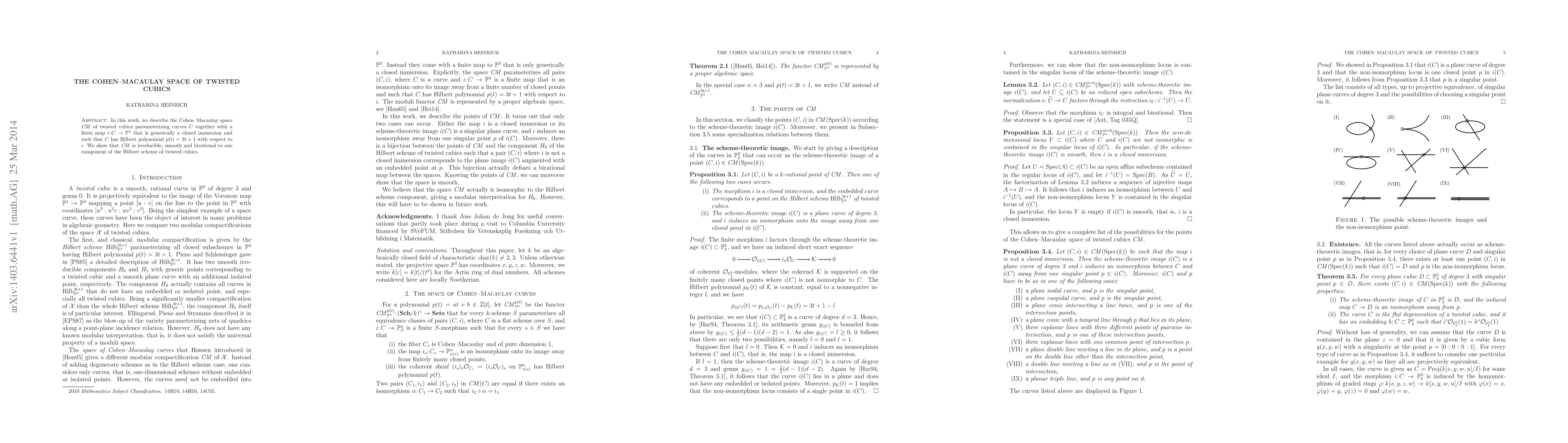 The paper describes the Cohen-Macaulay space CM of twisted cubics, characterizing it as irreducible, smooth, and birational to one component of the Hilbert scheme of twisted cubics. It provides detailed constructions and proofs involving flat one-parameter families and Cohen-Macaulay curves with specific Hilbert polynomials.