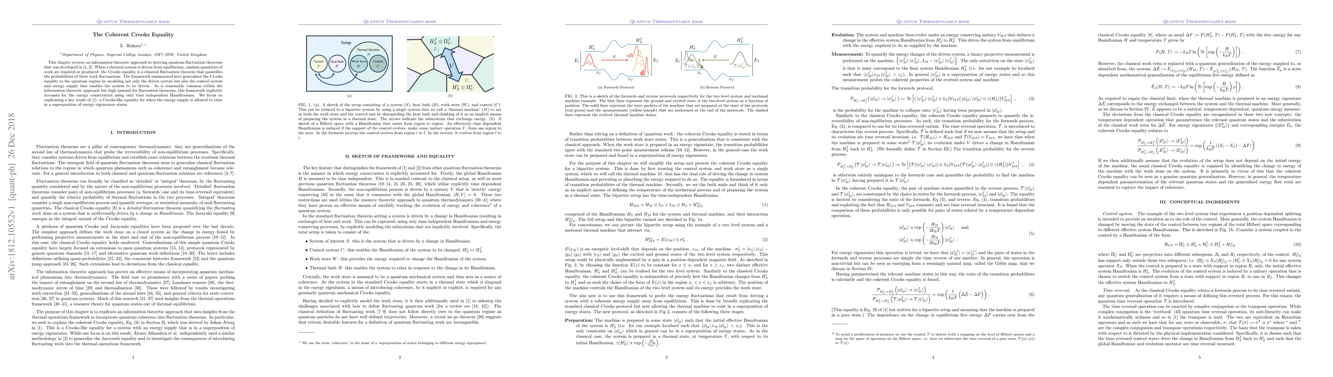 This chapter reviews an information theoretic approach to deriving quantum fluctuation theorems. When a thermal system is driven from equilibrium, random quantities of work are required or produced: the Crooks equality is a classical fluctuation theorem that quantifies the probabilities of these work fluctuations. The framework summarised here generalises the Crooks equality to the quantum regime by modeling not only the driven system but also the control system and energy supply that enables the system to be driven. As is reasonably common within the information theoretic approach but high unusual for fluctuation theorems, this framework explicitly accounts for the energy conservation using only time independent Hamiltonians. We focus on explicating a key result derived by Johan {\AA}berg: a Crooks-like equality for when the energy supply is allowed to exist in a superposition of energy eigenstates states.