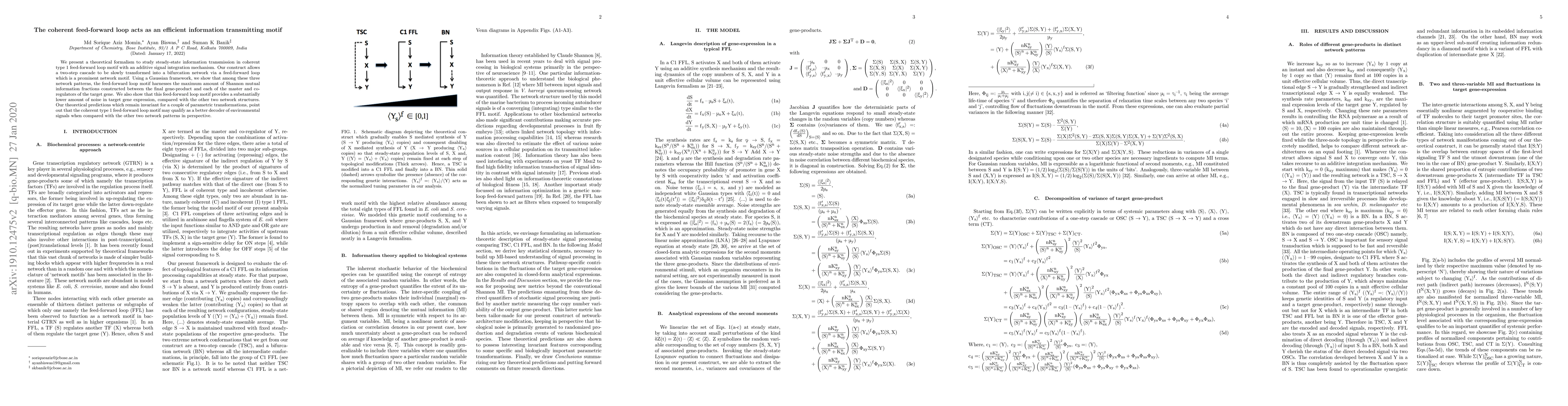 We present a theoretical formalism to study steady state information transmission in type 1 coherent feed-forward loop motif with an additive signal integration mechanism. Our construct allows a two-step cascade to be slowly transformed into a bifurcation network via a feed-forward loop which is a prominent network motif. Utilizing a Gaussian framework, we show that the feed-forward loop motif harnesses the maximum amount of Shannon mutual information fractions constructed between the input signaling species and the final gene product and also between the two downstream gene products. Our findings may explain why a feed-forward loop is naturally selected by the force of evolution as a motif in bacterial transcription control network while the two-step cascade and bifurcation network are not.