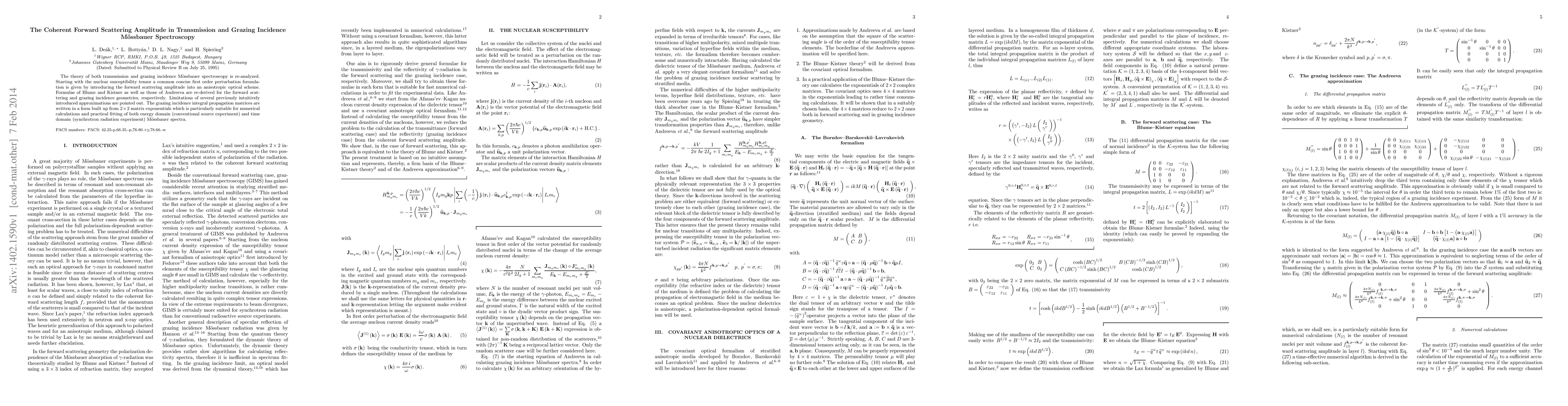This paper re-analyzes the theory of transmission and grazing incidence Mössbauer spectroscopy, deriving new concise first-order perturbation formulations for forward scattering amplitudes and re-evaluating previous approximations. It introduces matrix exponentials for practical numerical calculations and fitting of Mössbauer spectra in both energy and time domains.
