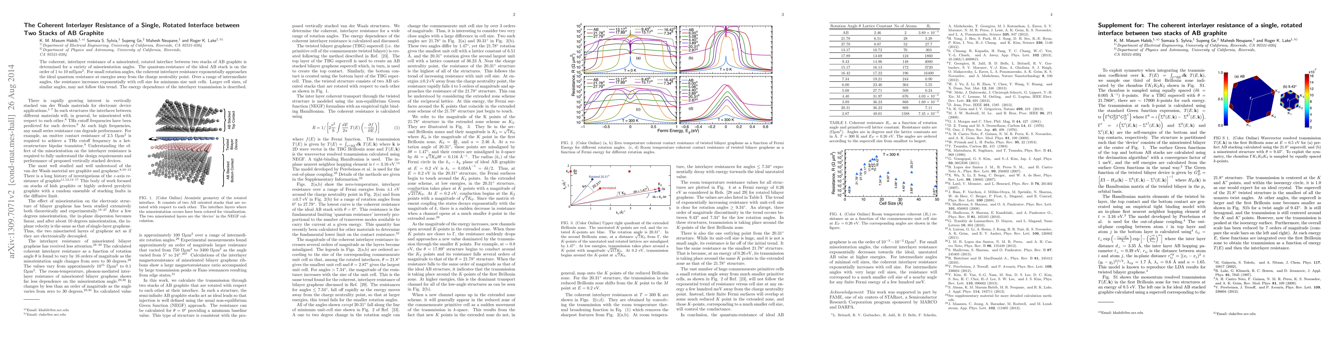 Researchers studied the resistance between two stacks of AB graphite with rotated interfaces, finding that small rotations lead to low resistance similar to an ideal stack, while larger rotations result in higher resistance that depends on cell size.